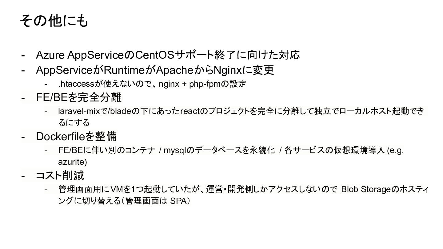 - FE/BEを完全分離 - laravel-mixで/bladeの下にあったreactのプロジェクトを完全に分離して独立でローカルホスト起動でき るにする - Dockerfileを整備 - FE/BEに伴い別のコンテナ / mysqlのデータベースを永続化 / 各サービスの仮想環境導入 (e.g. azurite) - コスト削減 - 管理画面用にVMを1つ起動していたが、運営・開発側しかアクセスしないので Blob Storageのホスティ ングに切り替える(管理画面は SPA)