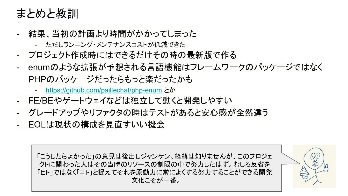 - https://github.com/paillechat/php-enum とか - FE/BEやゲートウェイなどは独立して動くと開発しやすい - グレードアップやリファクタの時はテストがあると安心感が全然違う - EOLは現状の構成を見直すいい機会 「こうしたらよかった」の意見は後出しジャンケン。経緯は知りませんが、このプロジェ クトに関わった人はその当時のリソースの制限の中で努力したはず。むしろ反省を 「ヒト」ではなく「コト」と捉えてそれを原動力に常によくする努力することができる開発 文化こそが一番。