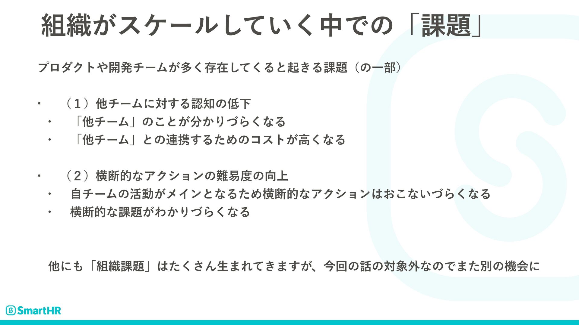 ৫͕εέʔϧ͍ͯ͘͠தͰͷʮ՝ʯ ϓϩμΫτ։ൃνʔϜ͕ଟ͘ଘࡏͯ͘͠Δͱى͖Δ՝ʢͷҰ෦ʣ w ʢ̍ʣଞνʔϜʹର͢ΔೝͷԼ w ʮଞνʔϜʯͷ͜ͱ͕͔ΓͮΒ͘ͳΔ w ʮଞνʔϜʯͱͷ࿈ܞ͢ΔͨΊͷίετ͕ߴ͘ͳΔ w ʢ̎ʣԣஅతͳΞΫγϣϯͷқͷ্