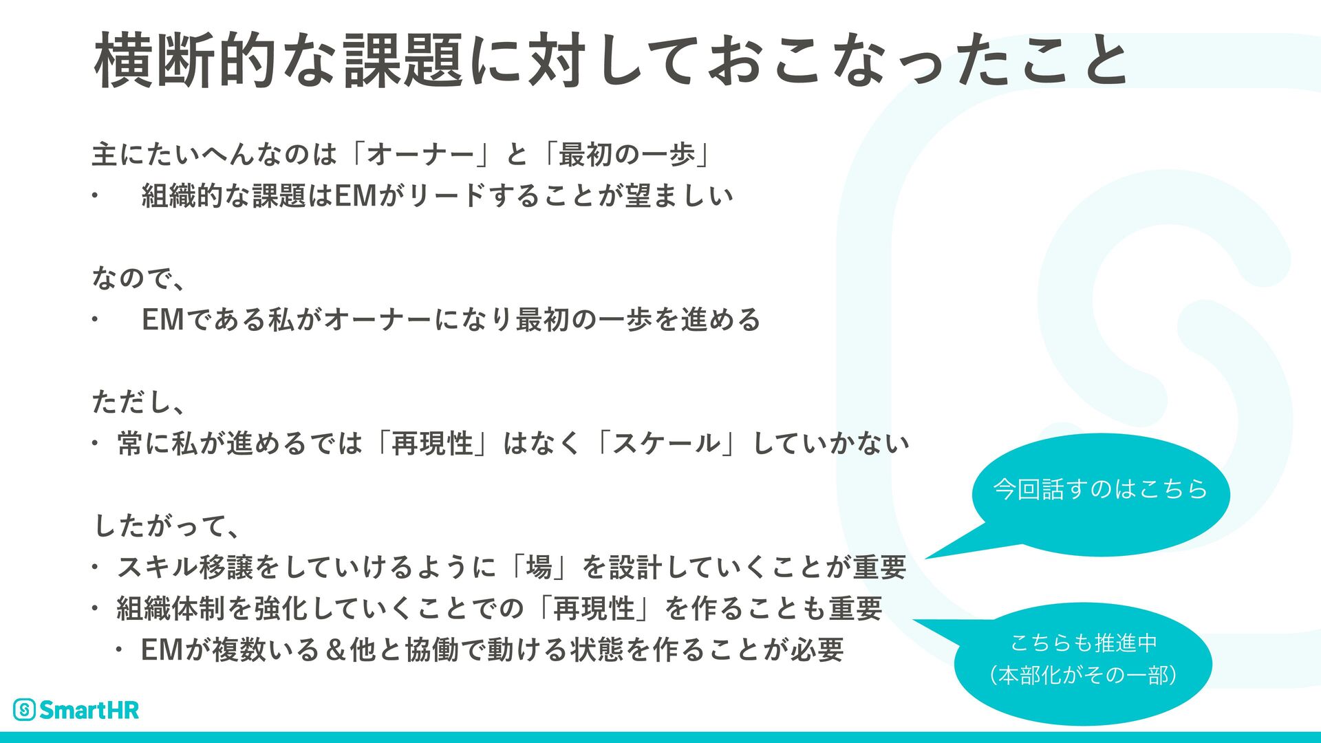ԣஅతͳ՝ʹର͓ͯ͜͠ͳͬͨ͜ͱ ओʹ͍ͨΜͳͷʮΦʔφʔʯͱʮ࠷ॳͷҰาʯ w ৫తͳ՝&.͕Ϧʔυ͢Δ͜ͱ͕·͍͠ ͳͷͰɺ w &.Ͱ͋Δࢲ͕ΦʔφʔʹͳΓ࠷ॳͷҰาΛਐΊΔ ͨͩ͠ɺ w ৗʹࢲ͕ਐΊΔͰʮ࠶ݱੑʯͳ͘ʮεέʔϧʯ͍͔ͯ͠ͳ͍