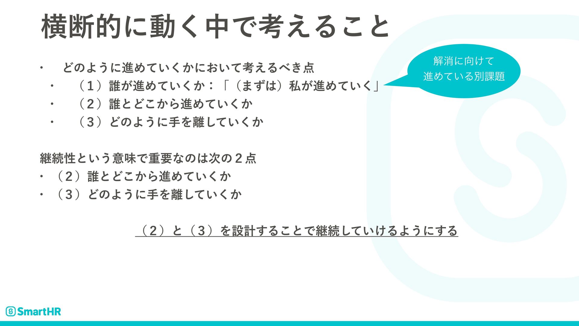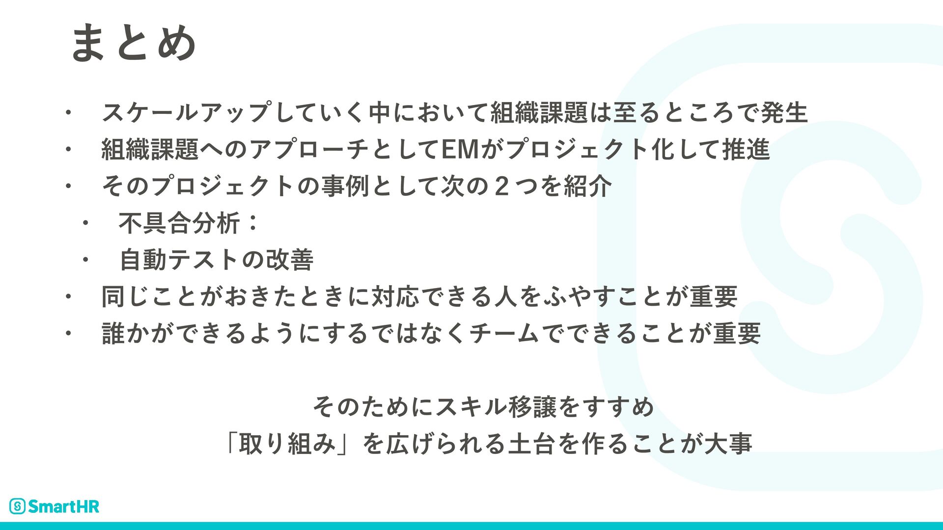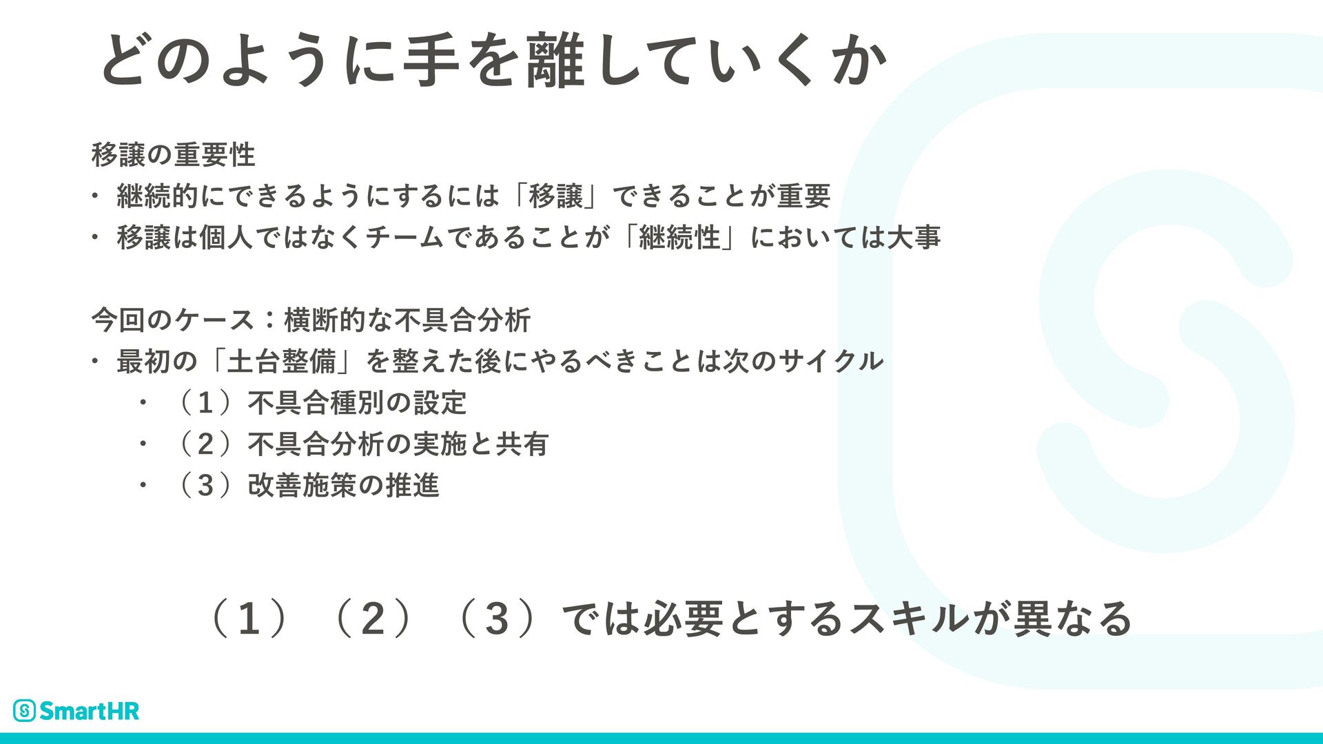 ͲͷΑ͏ʹखΛ͍͔ͯ͘͠ Ҡৡͷॏཁੑ w ܧଓతʹͰ͖ΔΑ͏ʹ͢ΔʹʮҠৡʯͰ͖Δ͜ͱ͕ॏཁ w ҠৡݸਓͰͳ͘νʔϜͰ͋Δ͜ͱ͕ʮܧଓੑʯʹ͓͍ͯେࣄ ࠓճͷέʔεɿԣஅతͳෆ۩߹ੳ w ࠷ॳͷʮඋʯΛ͑ͨޙʹΔ͖͜ͱ࣍ͷαΠΫϧ w