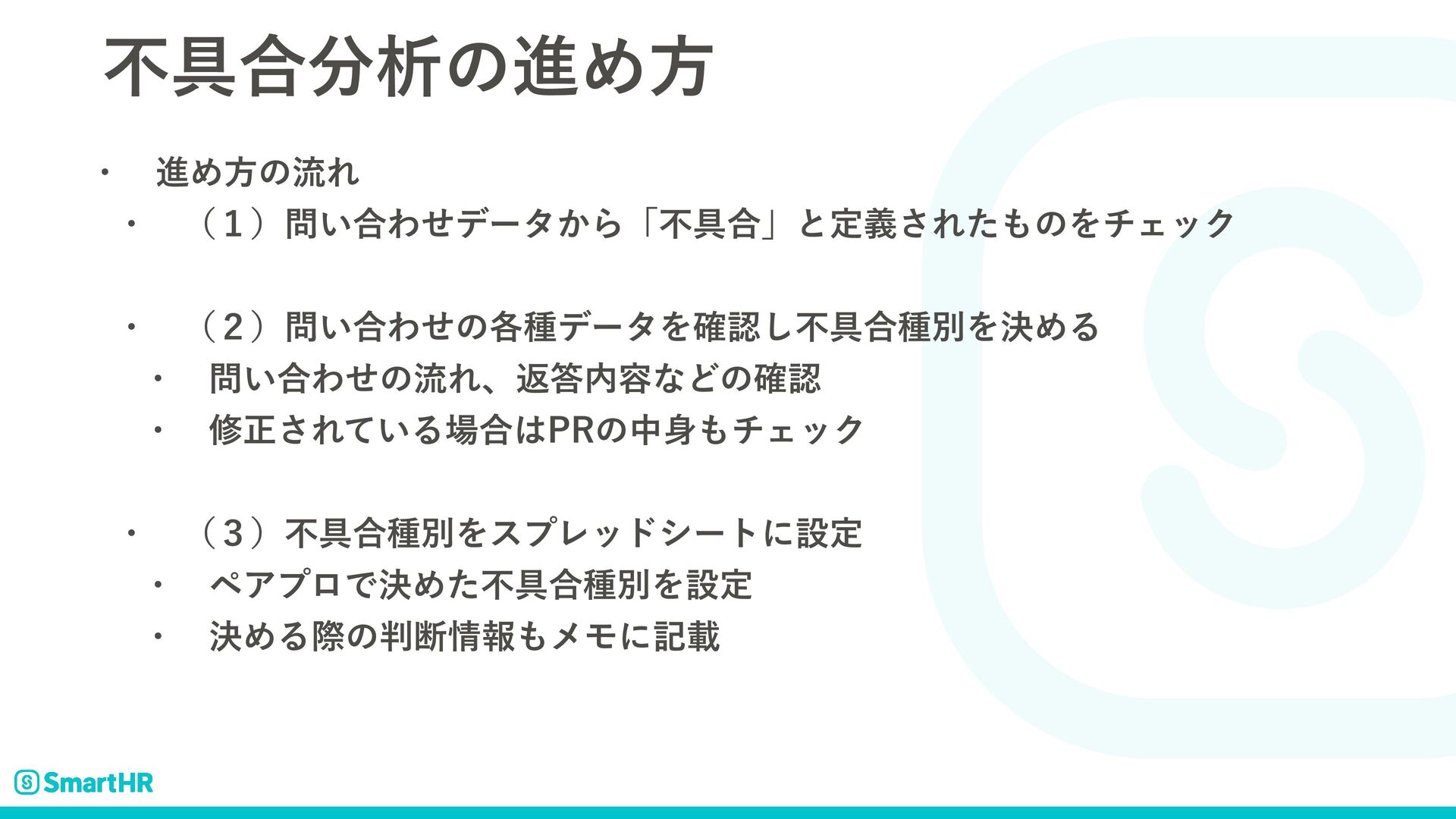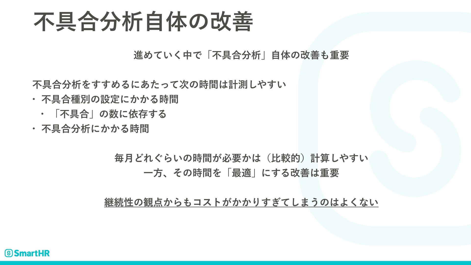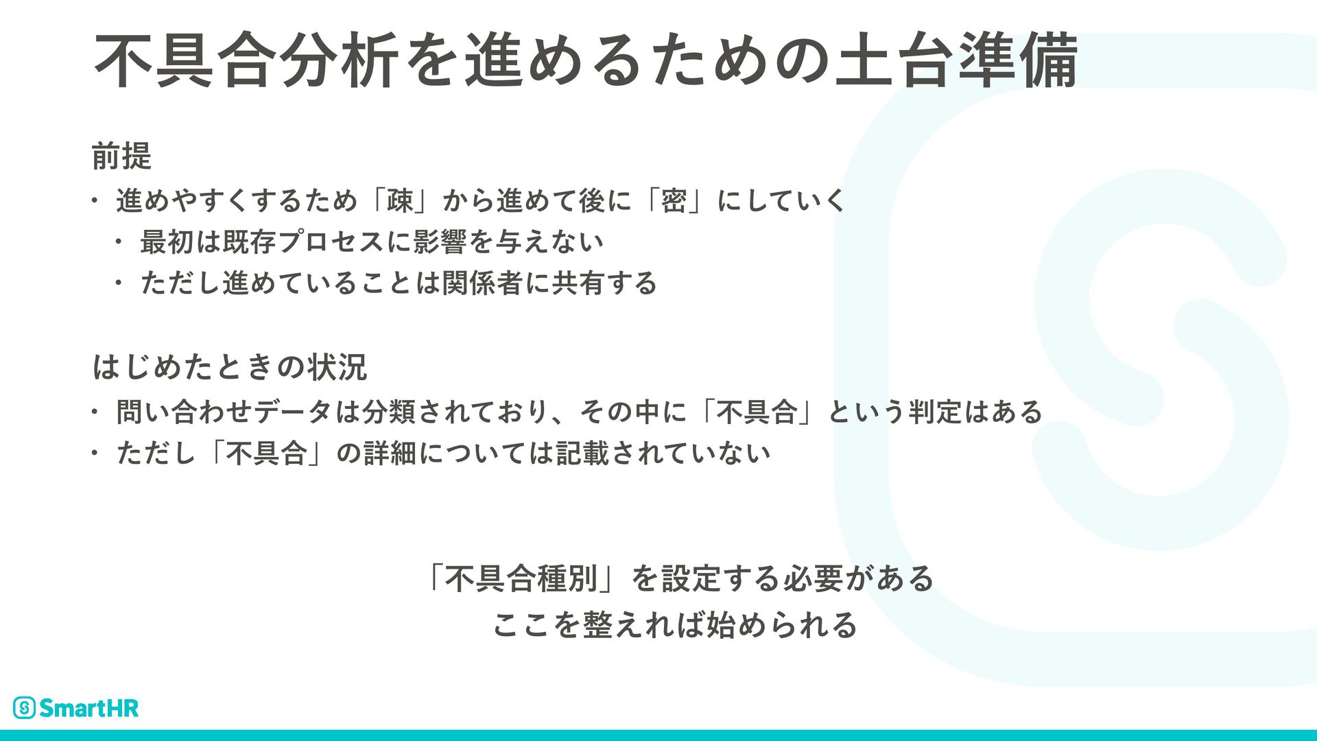 ݱࡏͷঢ়گ w ୲ɿ࿑ϓϩμΫτ࣭อূ෦ͷ̍νʔϜ w ݱࡏɺଞνʔϜͷϝϯόʔҠৡதͰདྷظ͔Β̎νʔϜͰରԠ༧ఆ ͳʹΛ͓͜ͳ͍ͬͯΔ͔ʁ w ෆ۩߹ੳͷఆظతͳ࣮ࢪ w ظؒʢ2୯ҐʣΛ۠ͬͯ·ͱΊͯෆ۩߹ੳ