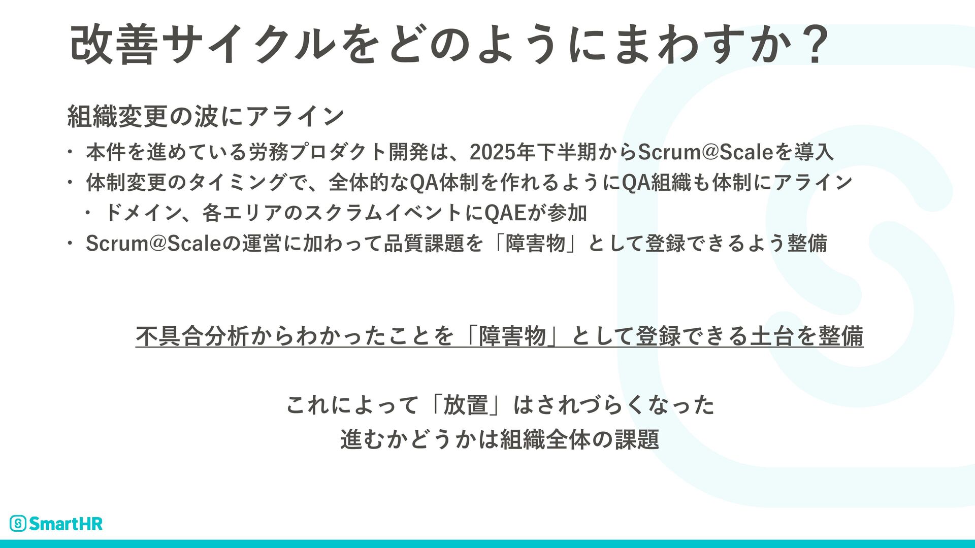վળαΠΫϧΛͲͷΑ͏ʹ·Θ͔͢ʁ ৫มߋͷʹΞϥΠϯ w ຊ݅ΛਐΊ͍ͯΔ࿑ϓϩμΫτ։ൃɺԼظ͔Β4DSVN!4DBMFΛಋೖ w ମ੍มߋͷλΠϛϯάͰɺશମతͳ2"ମ੍Λ࡞ΕΔΑ͏ʹ2"৫ମ੍ʹΞϥΠϯ w υϝΠϯɺ֤ΤϦΞͷεΫϥϜΠϕϯτʹ2"&͕ࢀՃ w 4DSVN!4DBMFͷӡӦʹՃΘ࣭ͬͯ՝Λʮোʯͱͯ͠ొͰ͖ΔΑ͏උ