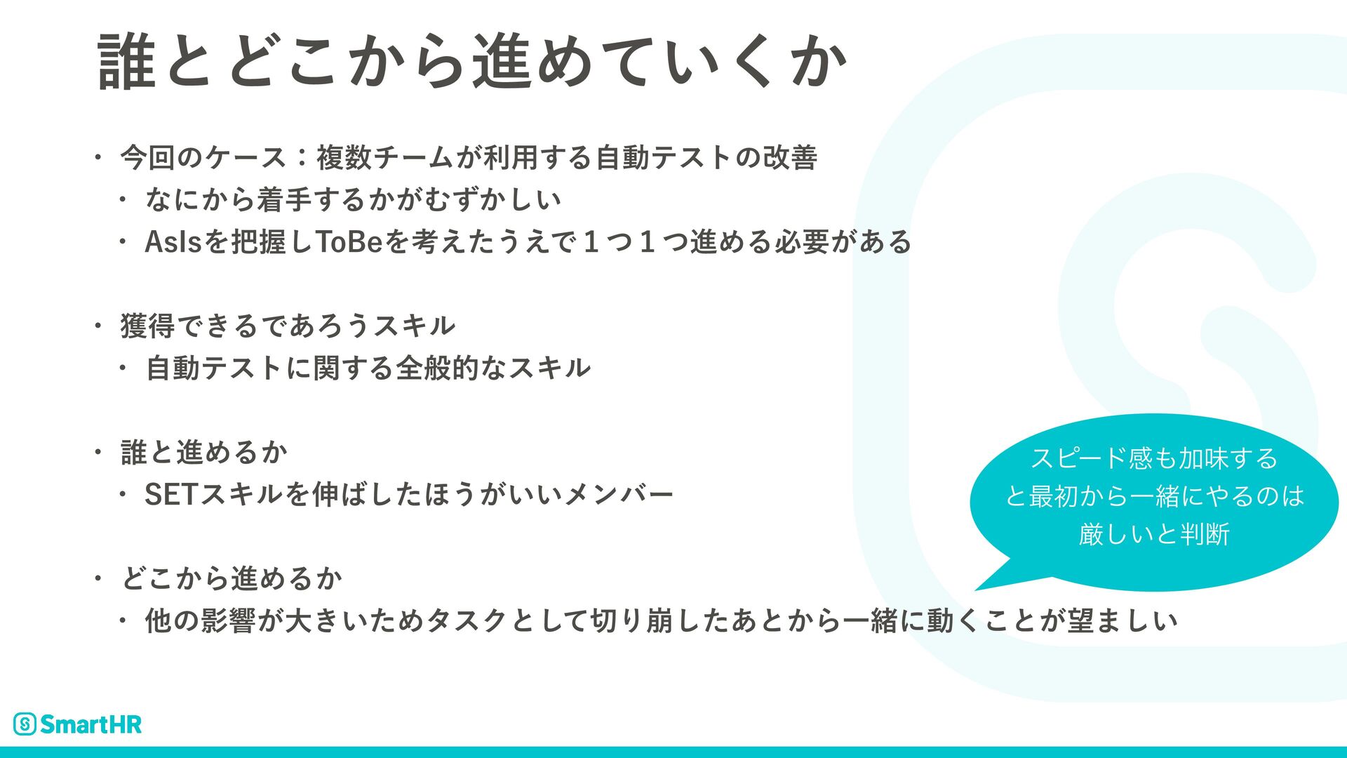 ࣗಈςετʹؔ͢ΔશൠతͳεΩϧ w ୭ͱਐΊΔ͔ w 4&5εΩϧΛ৳ͨ͠΄͏͕͍͍ϝϯόʔ w Ͳ͔͜ΒਐΊΔ͔ w ଞͷӨڹ͕େ͖͍ͨΊλεΫͱͯ͠Γ่ͨ͋͠ͱ͔ΒҰॹʹಈ͘͜ͱ͕·͍͠ εϐʔυײՃຯ͢Δ ͱ࠷ॳ͔ΒҰॹʹΔͷ ݫ͍͠ͱஅ