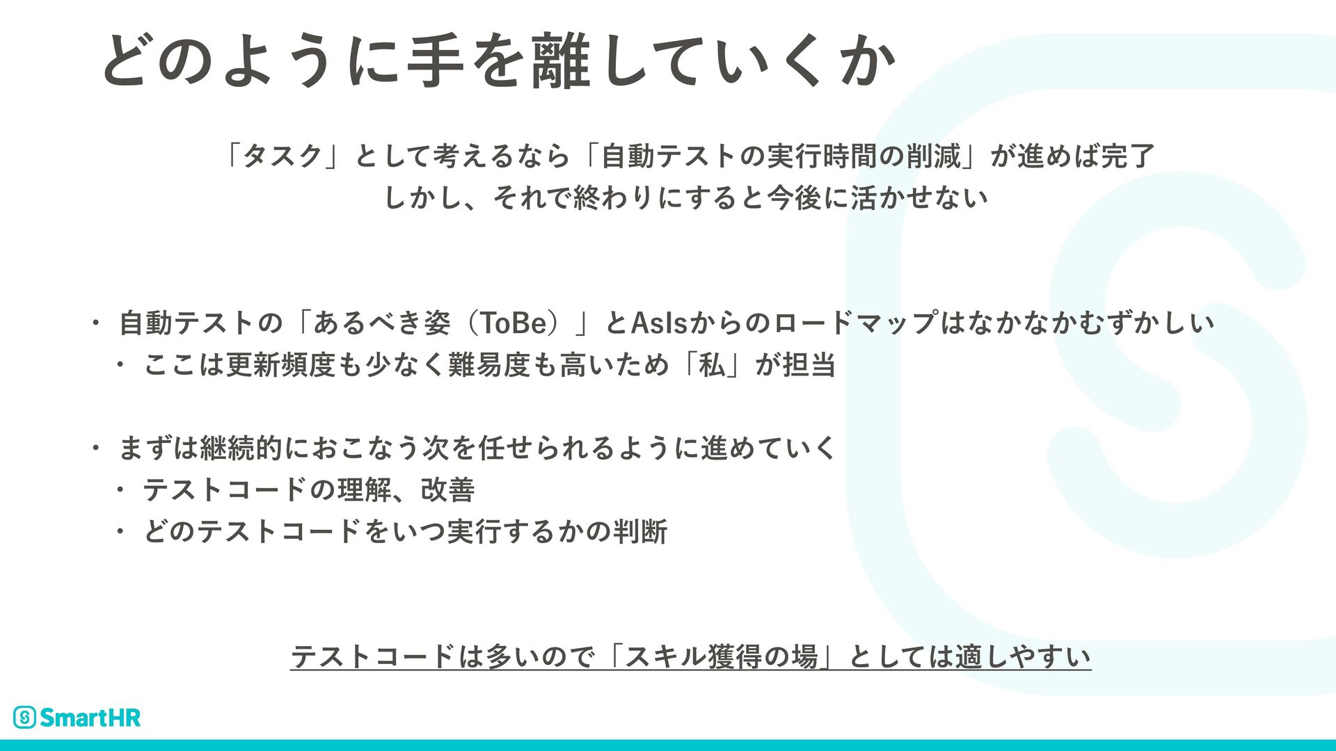ͲͷΑ͏ʹखΛ͍͔ͯ͘͠ ʮλεΫʯͱͯ͠ߟ͑ΔͳΒʮࣗಈςετͷ࣮ߦ࣌ؒͷݮʯ͕ਐΊྃ ͔͠͠ɺͦΕͰऴΘΓʹ͢Δͱࠓޙʹ׆͔ͤͳ͍ w ࣗಈςετͷʮ͋Δ͖࢟ʢ5P#Fʣʯͱ"T*T͔ΒͷϩʔυϚοϓͳ͔ͳ͔Ή͔͍ͣ͠ w ͜͜ߋ৽සগͳ͘қߴ͍ͨΊʮࢲʯ͕୲ w ·ͣܧଓతʹ͓͜ͳ͏࣍ΛͤΒΕΔΑ͏ʹਐΊ͍ͯ͘ w