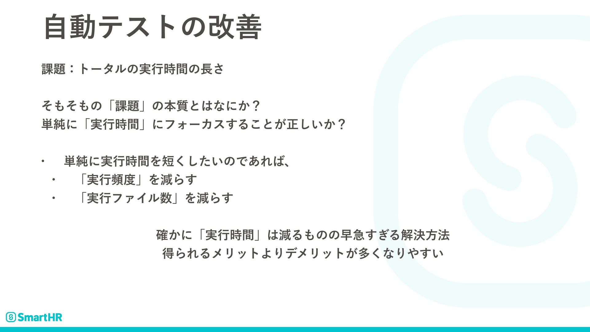 ࣗಈςετͷվળ ՝ɿτʔλϧͷ࣮ߦ࣌ؒͷ͞ ͦͦͷʮ՝ʯͷຊ࣭ͱͳʹ͔ʁ ୯७ʹʮ࣮ߦ࣌ؒʯʹϑΥʔΧε͢Δ͜ͱ͕ਖ਼͍͔͠ʁ w ୯७ʹ࣮ߦ࣌ؒΛ͍ͨ͘͠ͷͰ͋Εɺ w ʮ࣮ߦසʯΛݮΒ͢ w ʮ࣮ߦϑΝΠϧʯΛݮΒ͢