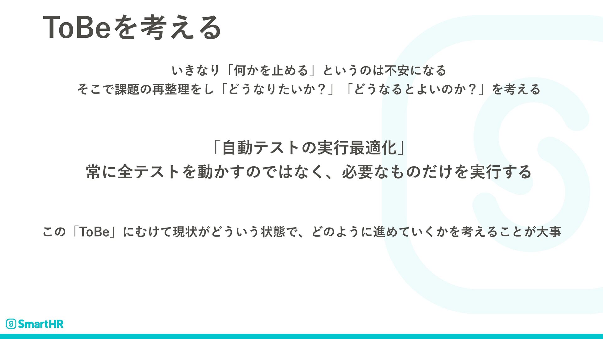 5P#FΛߟ͑Δ ͍͖ͳΓʮԿ͔ΛࢭΊΔʯͱ͍͏ͷෆ҆ʹͳΔ ͦ͜Ͱ՝ͷ࠶ཧΛ͠ʮͲ͏ͳΓ͍͔ͨʁʯʮͲ͏ͳΔͱΑ͍ͷ͔ʁʯΛߟ͑Δ ʮࣗಈςετͷ࣮ߦ࠷దԽʯ ৗʹશςετΛಈ͔͢ͷͰͳ͘ɺඞཁͳͷ͚ͩΛ࣮ߦ͢Δ ͜ͷʮ5P#FʯʹΉ͚ͯݱঢ়͕Ͳ͏͍͏ঢ়ଶͰɺͲͷΑ͏ʹਐΊ͍͔ͯ͘Λߟ͑Δ͜ͱ͕େࣄ