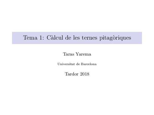 pitag` orica. Es compleix Sigui d = mcd(x, y, z) llavors (x/d, y/d, z/d) tamb´ e ´ es una terna pitag` orica. Sigui t ∈ Z llavors (tx, ty, tz) tamb´ e ´ es una terna pitag` orica.