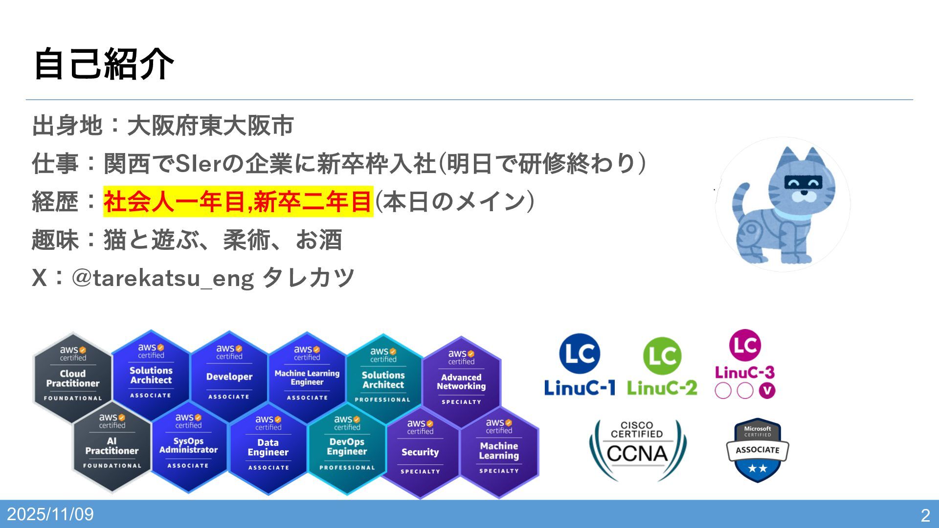 2025/11/09 ग़ɿେࡕ౦େࡕࢢ ࣄɿؔͰSIerͷاۀʹ৽ଔೖࣾ(໌ͰݚमऴΘΓ) ܦྺɿࣾձਓҰ,৽ଔೋ(ຊͷϝΠϯ) झຯɿೣͱ༡Ϳɺॊज़ɺ͓ञ Xɿ@tarekatsu_eng λϨΧπ ࣗݾհ 2