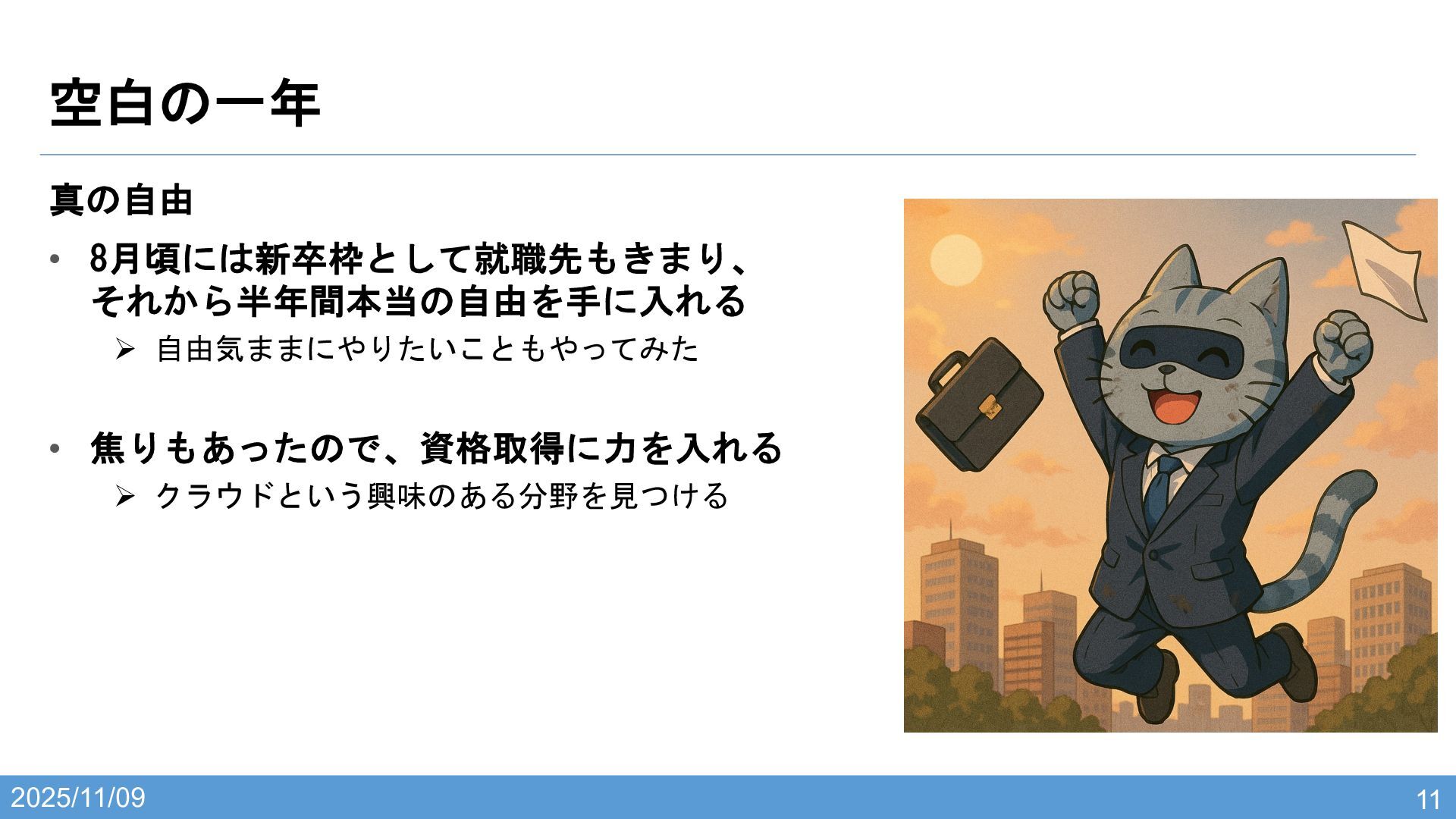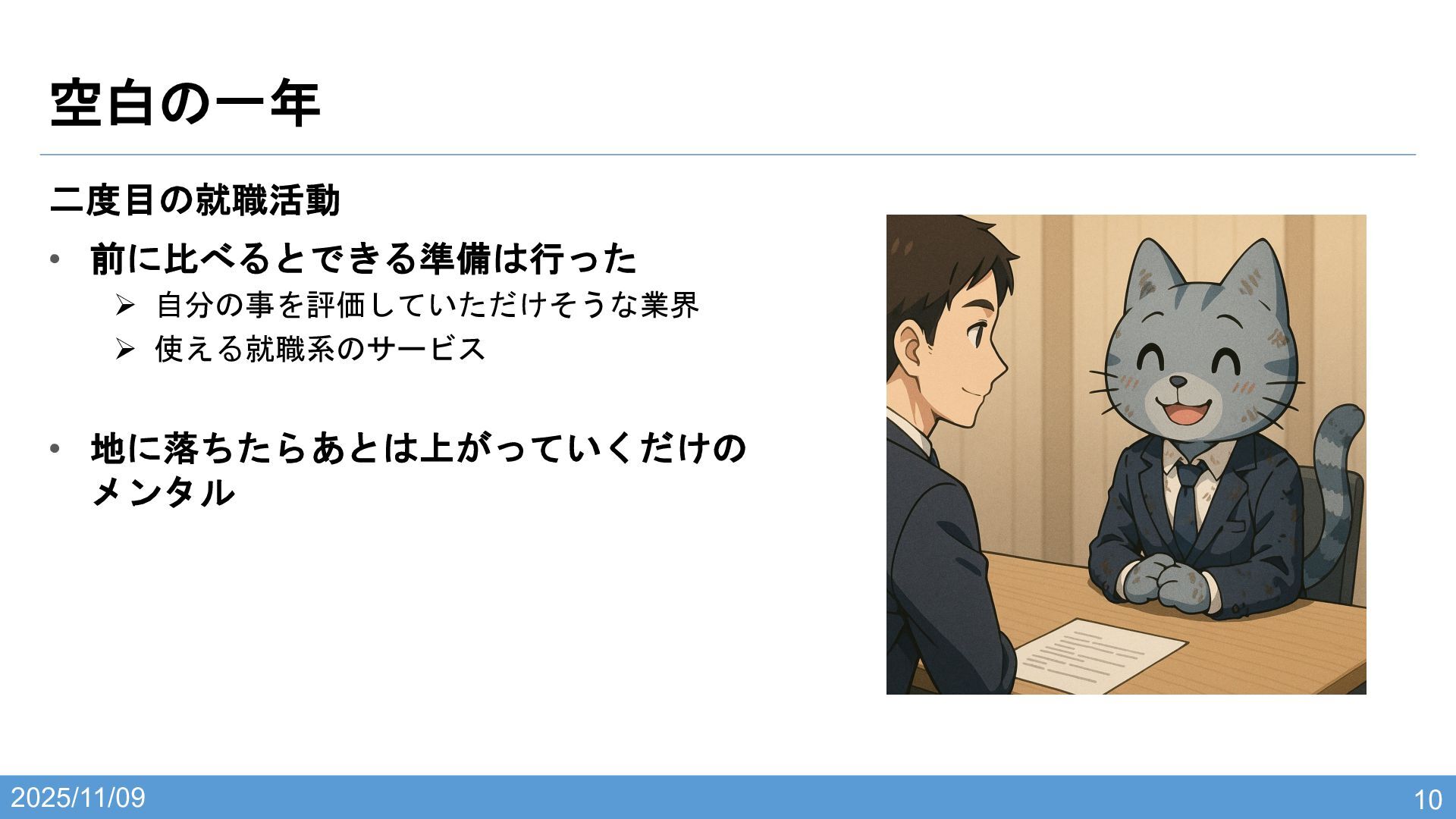 2025/11/09 空白の一年 10 二度目の就職活動 • 前に比べるとできる準備は行った Ø 自分の事を評価していただけそうな業界 Ø 使える就職系のサービス