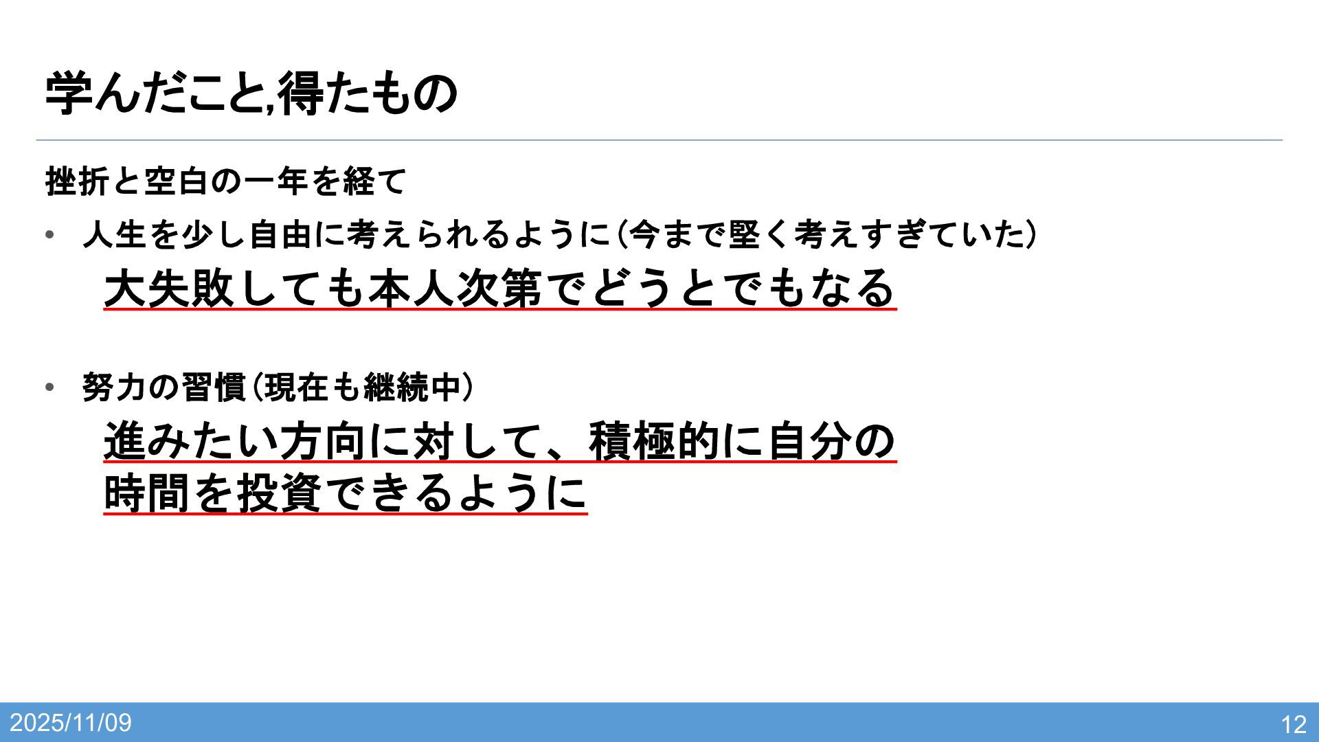 2025/11/09 学んだこと,得たもの 12 挫折と空白の一年を経て • 人生を少し自由に考えられるように(今まで堅く考えすぎていた) 大失敗しても本人次第でどうとでもなる • 努力の習慣(現在も継続中) 進みたい方向に対して、積極的に自分の
