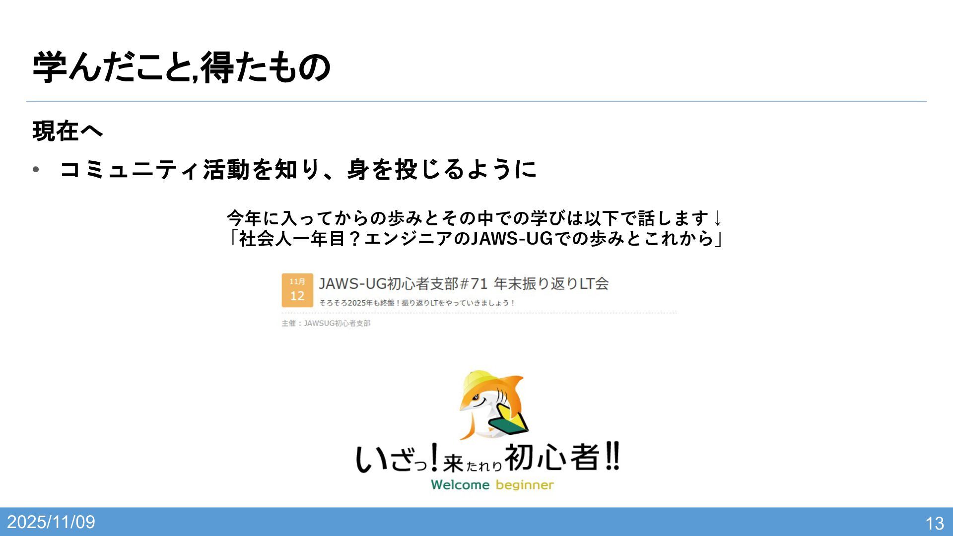 2025/11/09 学んだこと,得たもの 13 現在へ • コミュニティ活動を知り、身を投じるように 今年に⼊ってからの歩みとその中での学びは以下で話します↓ 「社会⼈⼀年⽬?エンジニアのJAWS-UGでの歩みとこれから」