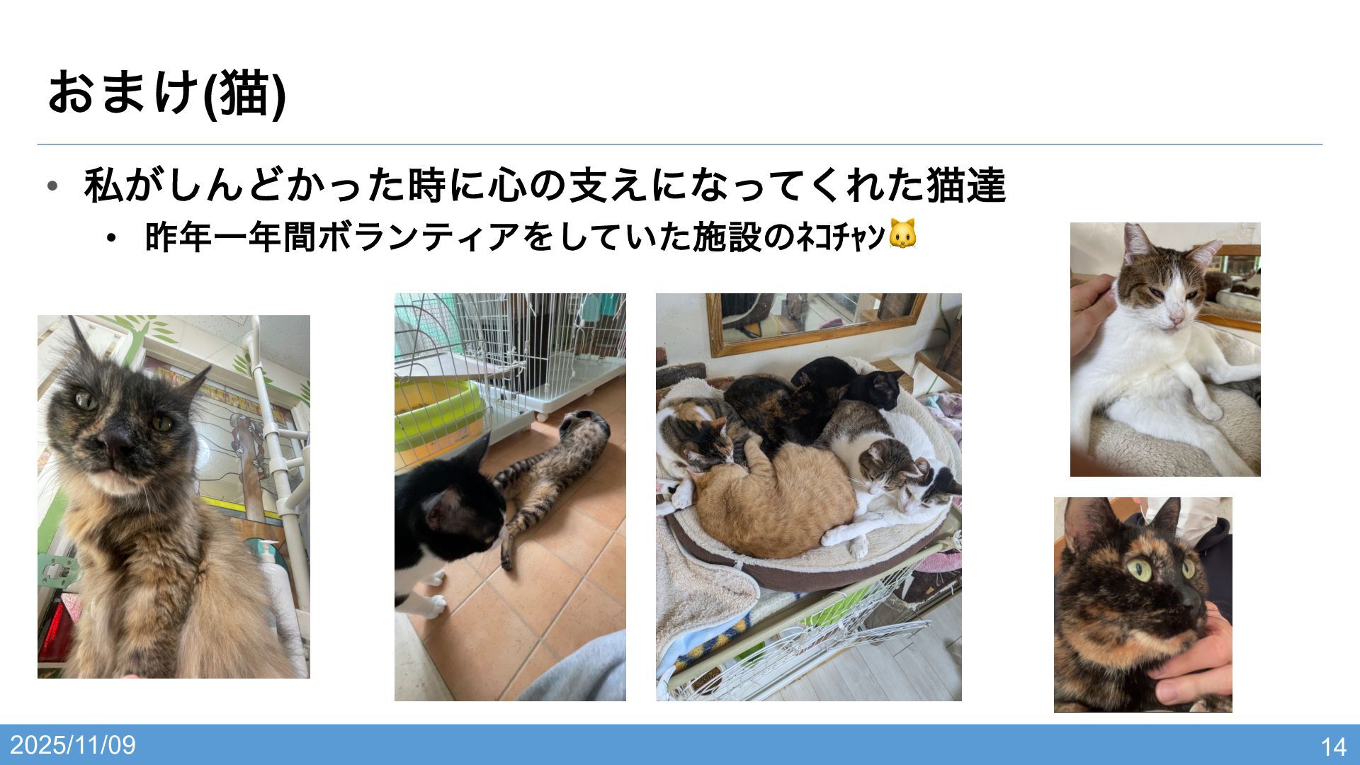 2025/11/09 • ࢲ͕͠ΜͲ͔ͬͨ࣌ʹ৺ͷࢧ͑ʹͳͬͯ͘Εͨೣୡ • ࡢҰؒϘϥϯςΟΞΛ͍ͯͨ͠ࢪઃͷŮŠŧŒƃ🐱 ͓·͚(ೣ) 14