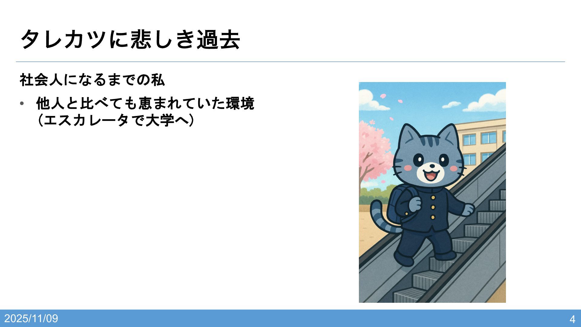 2025/11/09 λϨΧπʹ൵͖͠աڈ 4 社会人になるまでの私 • 他人と比べても恵まれていた環境 (エスカレータで大学へ)