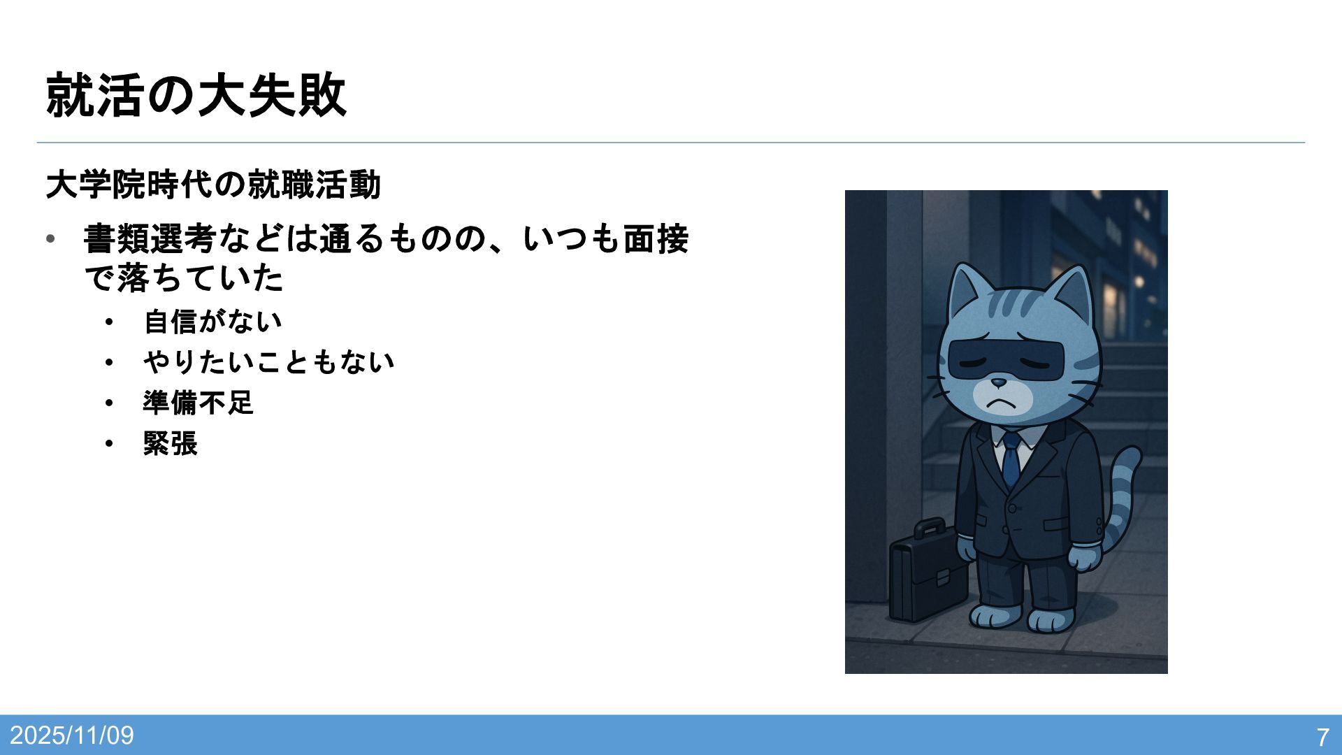 2025/11/09 就活の大失敗 7 大学院時代の就職活動 • 書類選考などは通るものの、いつも面接 で落ちていた • 自信がない •