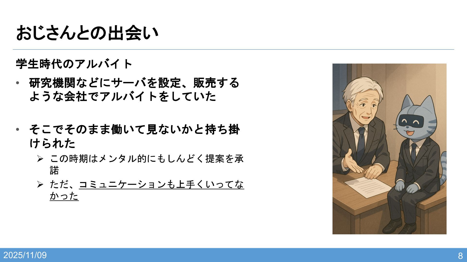 2025/11/09 おじさんとの出会い 8 学生時代のアルバイト • 研究機関などにサーバを設定、販売する ような会社でアルバイトをしていた • そこでそのまま働いて見ないかと持ち掛 けられた