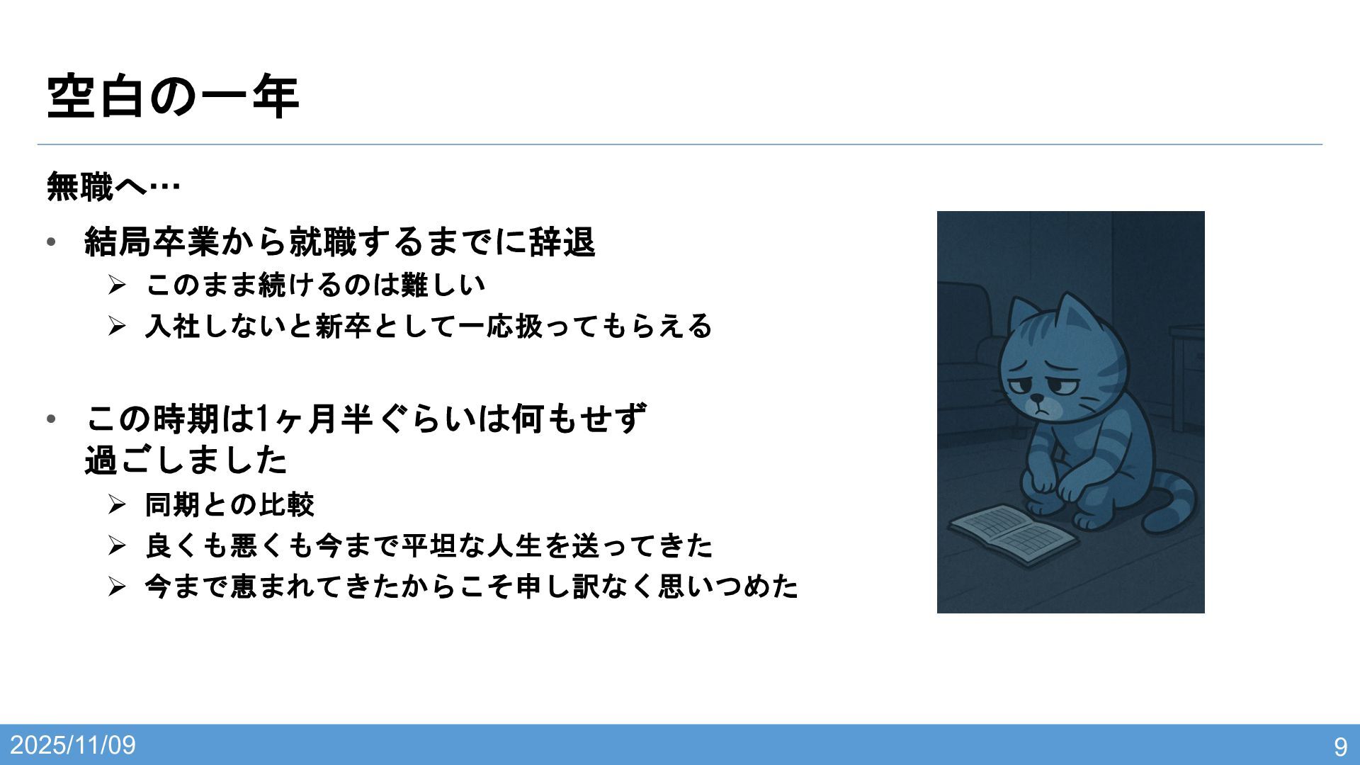 2025/11/09 空白の一年 9 無職へ… • 結局卒業から就職するまでに辞退 Ø このまま続けるのは難しい Ø 入社しないと新卒として一応扱ってもらえる