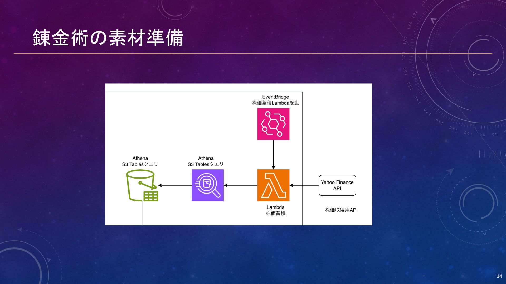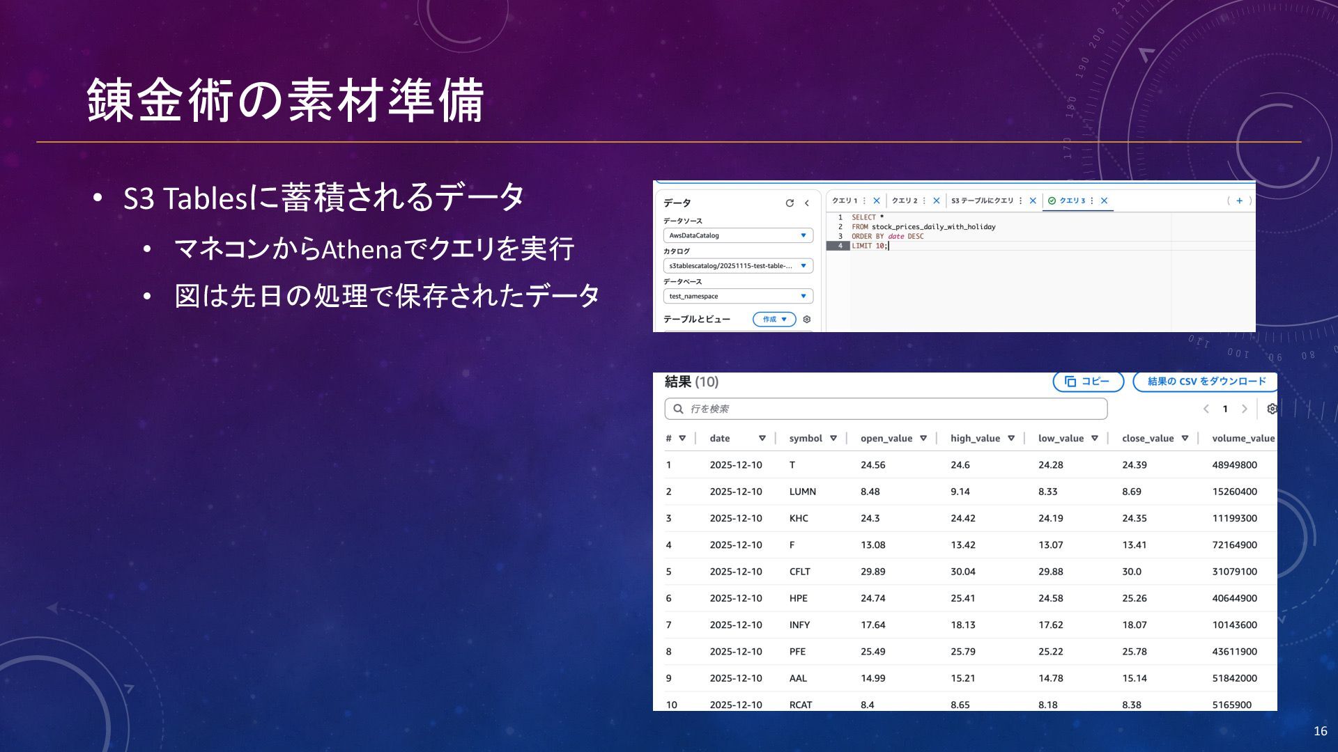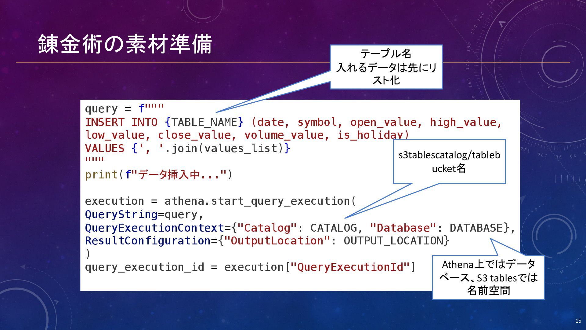 open_value, high_value, low_value, close_value, volume_value, is_holiday) VALUES {', '.join(values_list)} """ print(f"データ挿入中...") execution = athena.start_query_execution( QueryString=query, QueryExecutionContext={"Catalog": CATALOG, "Database": DATABASE}, ResultConfiguration={"OutputLocation": OUTPUT_LOCATION} ) query_execution_id = execution["QueryExecutionId"] s3tablescatalog/tableb ucket名 Athena上ではデータ ベース、S3 tablesでは 名前空間 テーブル名 入れるデータは先にリ スト化