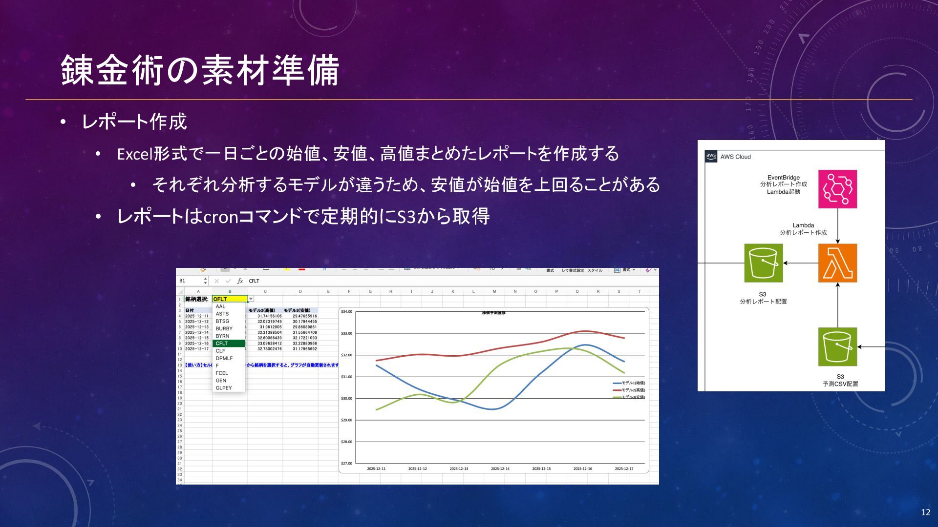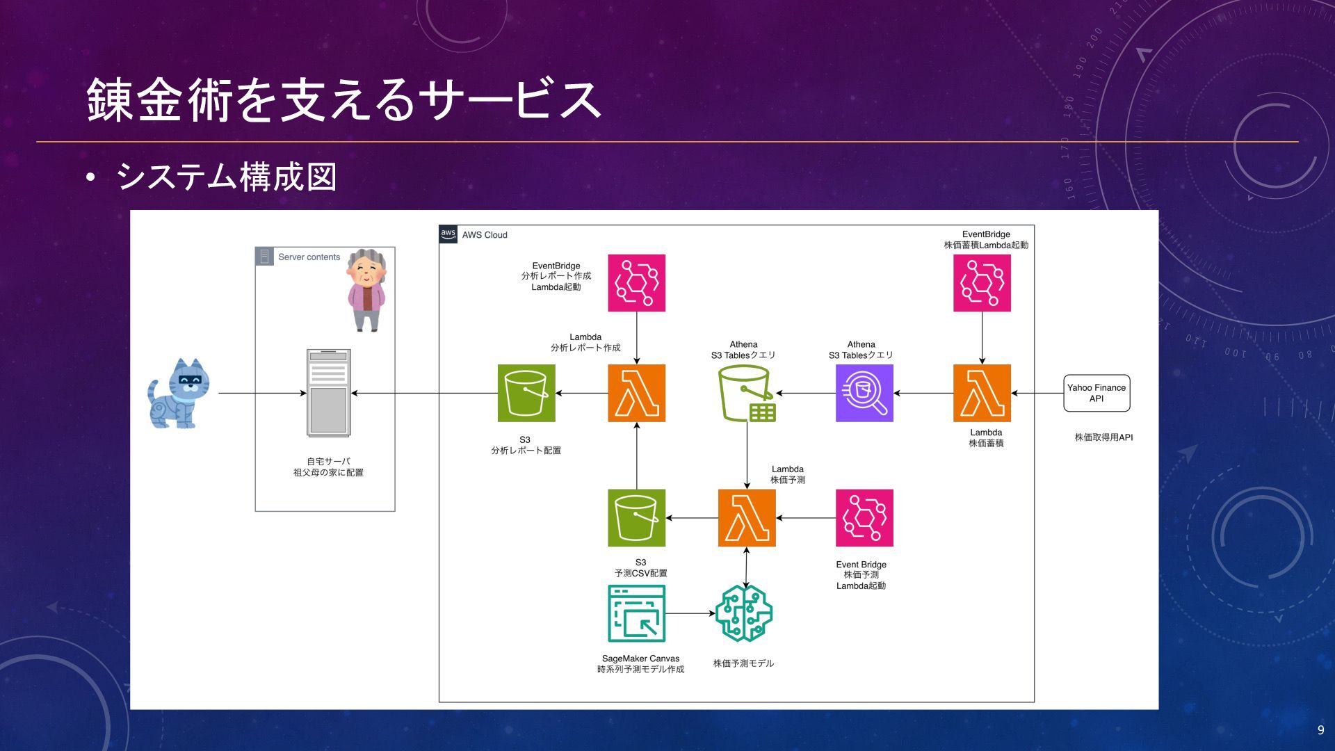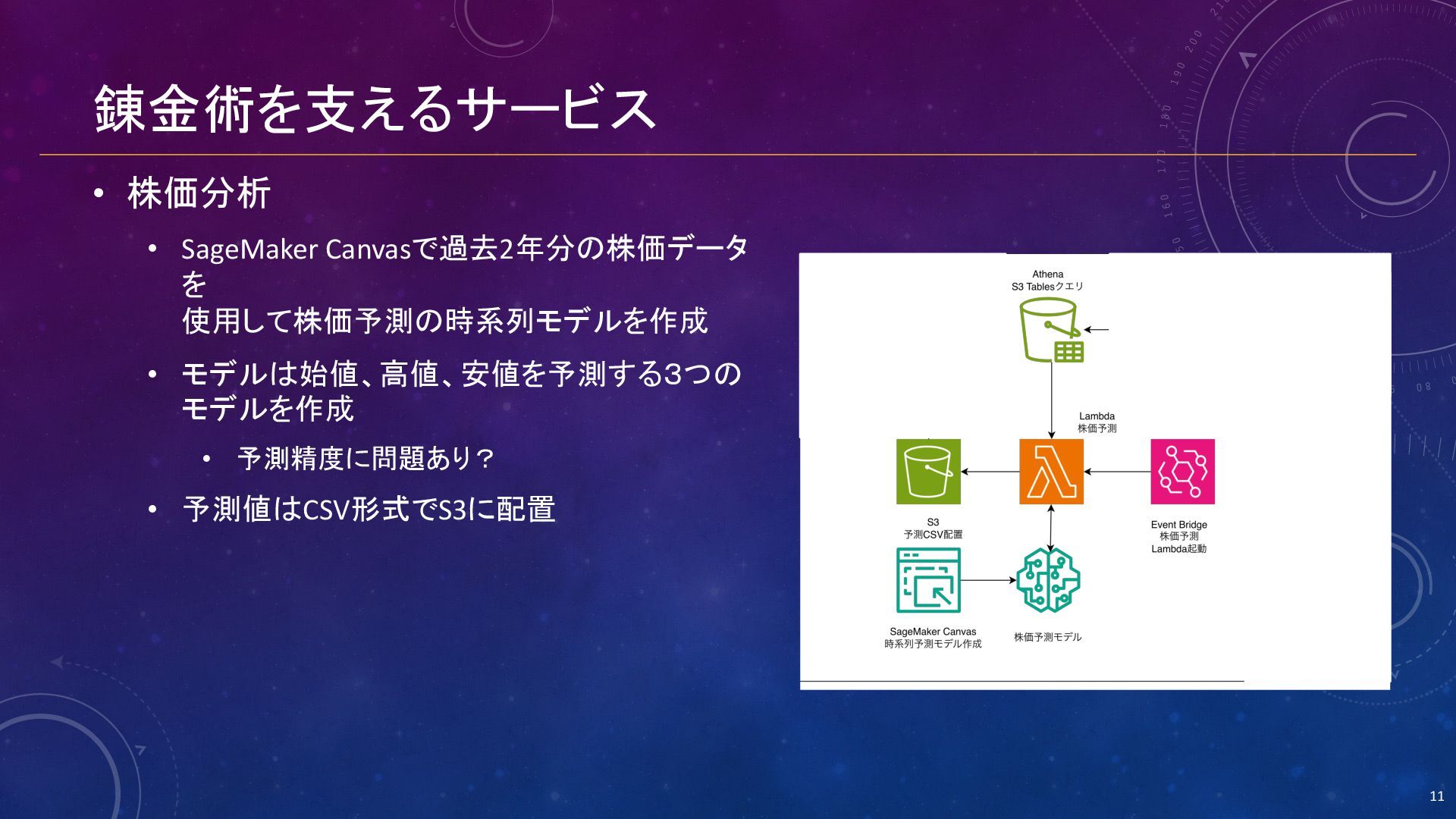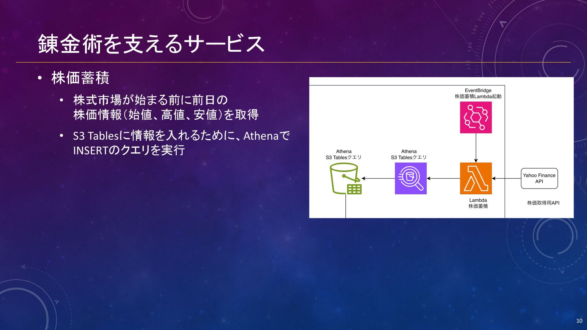 open_value, high_value, low_value, close_value, volume_value, is_holiday) VALUES {', '.join(values_list)} """ print(f"データ挿入中...") execution = athena.start_query_execution( QueryString=query, QueryExecutionContext={"Catalog": CATALOG, "Database": DATABASE}, ResultConfiguration={"OutputLocation": OUTPUT_LOCATION} ) query_execution_id = execution["QueryExecutionId"] s3tablescatalog/tableb ucket名 Athena上ではデータ ベース、S3 tablesでは 名前空間 テーブル名 入れるデータは先にリ スト化