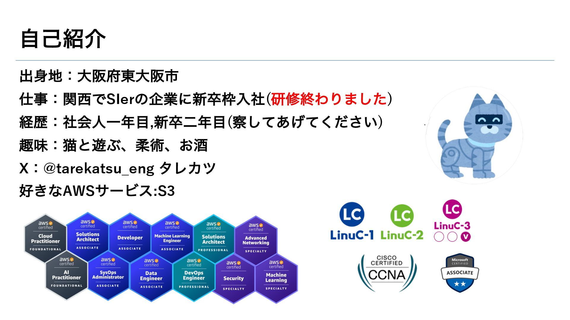ग़ɿେࡕ౦େࡕࢢ ࣄɿؔͰSIerͷاۀʹ৽ଔೖࣾ(ݚमऴΘΓ·ͨ͠) ܦྺɿࣾձਓҰ,৽ଔೋ(͍ͯ͋͛ͯͩ͘͠͞) झຯɿೣͱ༡Ϳɺॊज़ɺ͓ञ Xɿ@tarekatsu_eng λϨΧπ ͖ͳAWSαʔϏε:S3 ࣗݾհ
