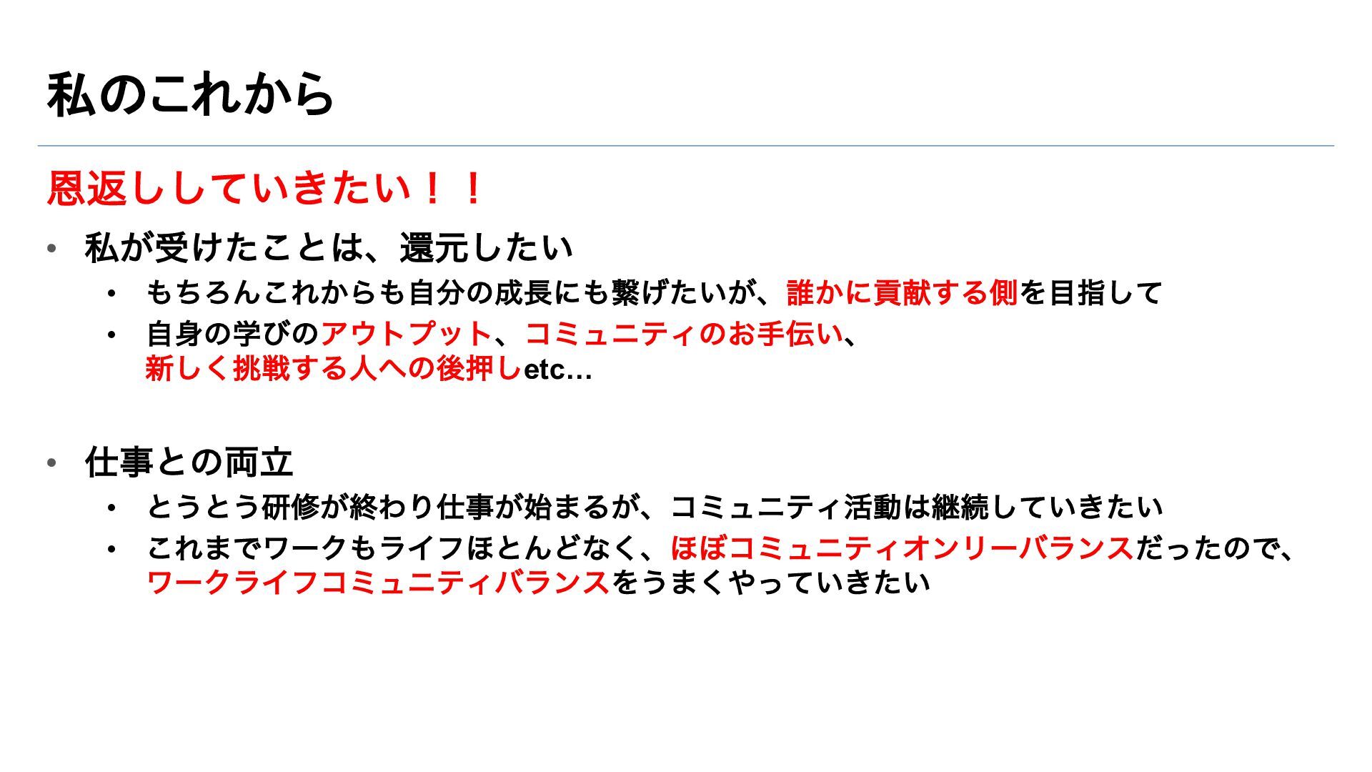 • ͱ͏ͱ͏ݚम͕ऴΘΓࣄ͕࢝·Δ͕ɺίϛϡχςΟ׆ಈܧଓ͍͖͍ͯͨ͠ • ͜Ε·ͰϫʔΫϥΠϑ΄ͱΜͲͳ͘ɺ΄΅ίϛϡχςΟΦϯϦʔόϥϯεͩͬͨͷͰɺ ϫʔΫϥΠϑίϛϡχςΟόϥϯεΛ͏·͍͖͍ͬͯͨ͘ 私のこれから