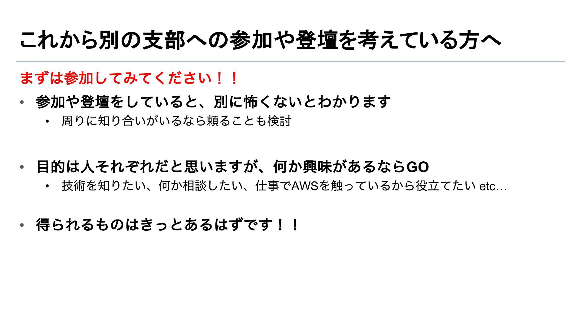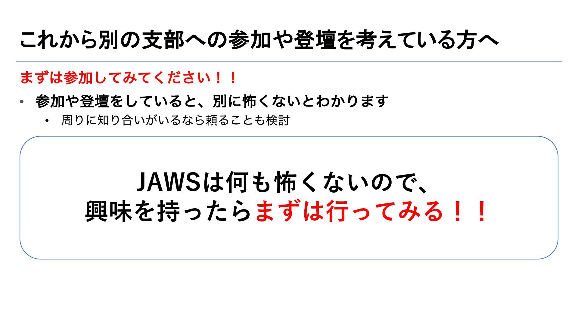 • ಘΒΕΔͷ͖ͬͱ͋ΔͣͰ͢ʂʂ これから別の支部への参加や登壇を考えている方へ JAWSは何も怖くないので、 興味を持ったらまずは⾏ってみる!!