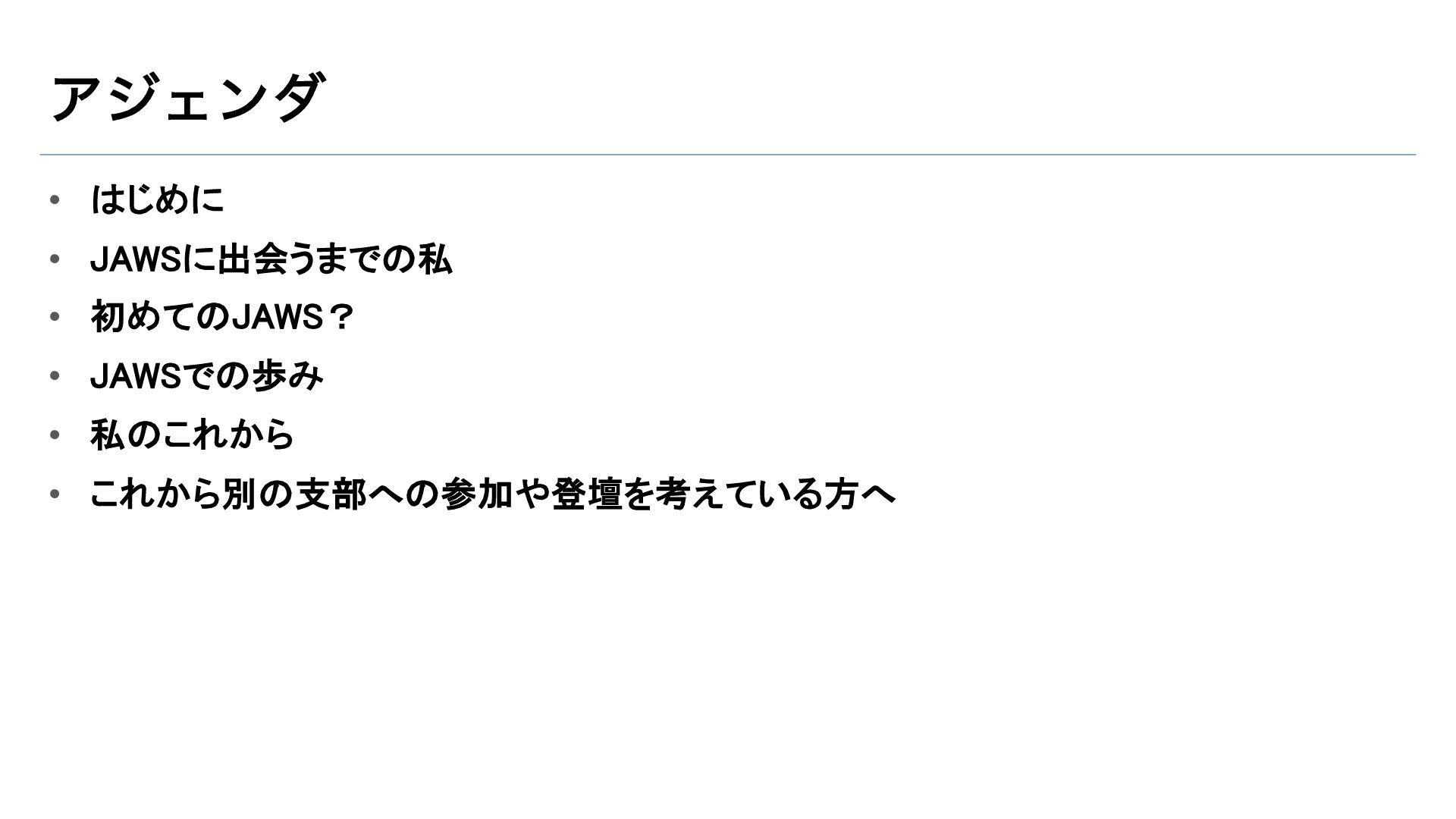 • はじめに • JAWSに出会うまでの私 • 初めてのJAWS? • JAWSでの歩み • 私のこれから