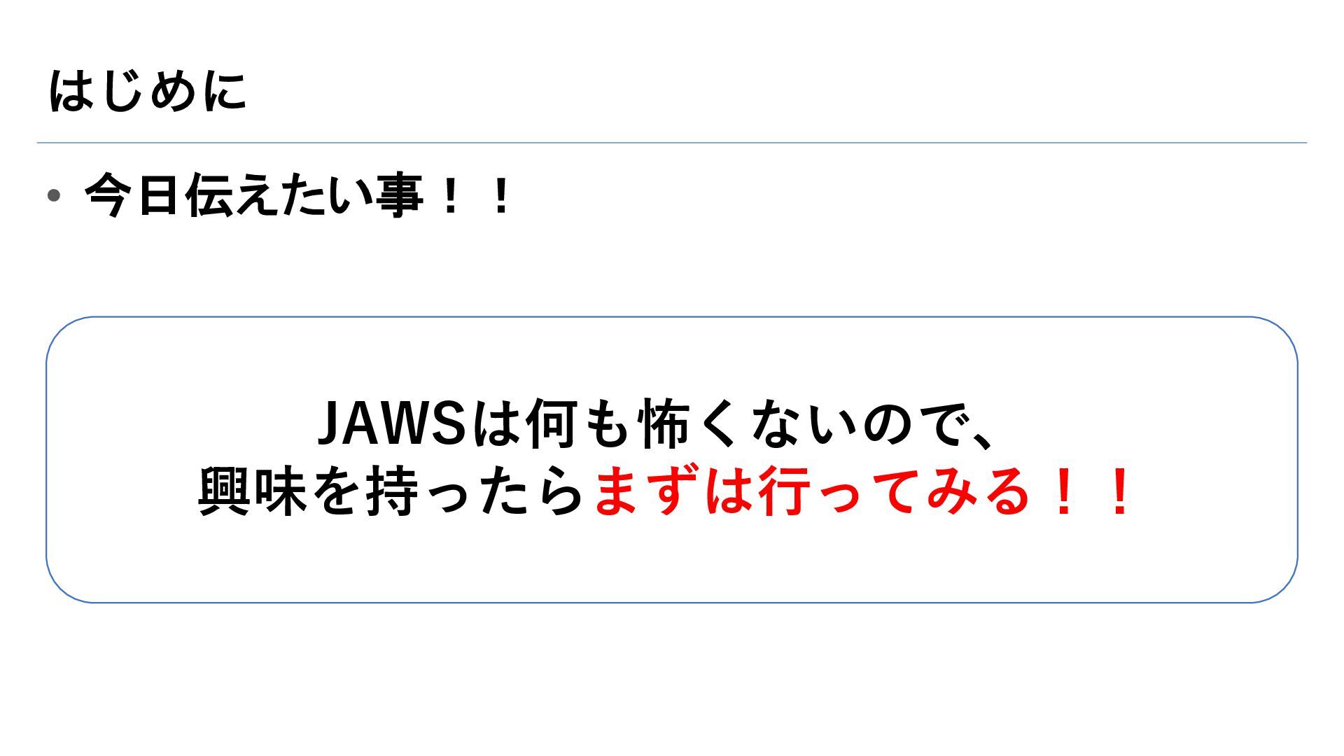 • 今日伝えたい事!! ͡Ίʹ JAWSは何も怖くないので、 興味を持ったらまずは⾏ってみる!!