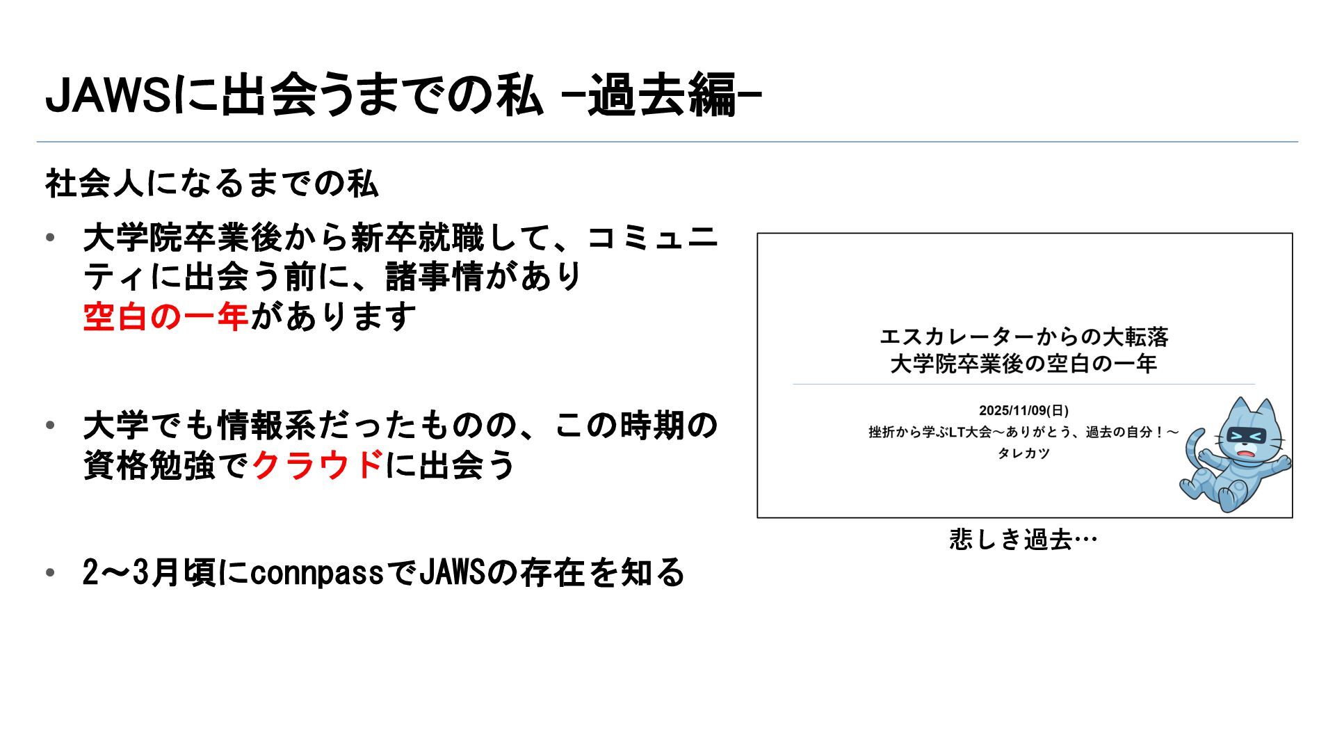 JAWSに出会うまでの私 –過去編- 社会人になるまでの私 • 大学院卒業後から新卒就職して、コミュニ ティに出会う前に、諸事情があり 空白の一年があります • 大学でも情報系だったものの、この時期の 資格勉強でクラウドに出会う