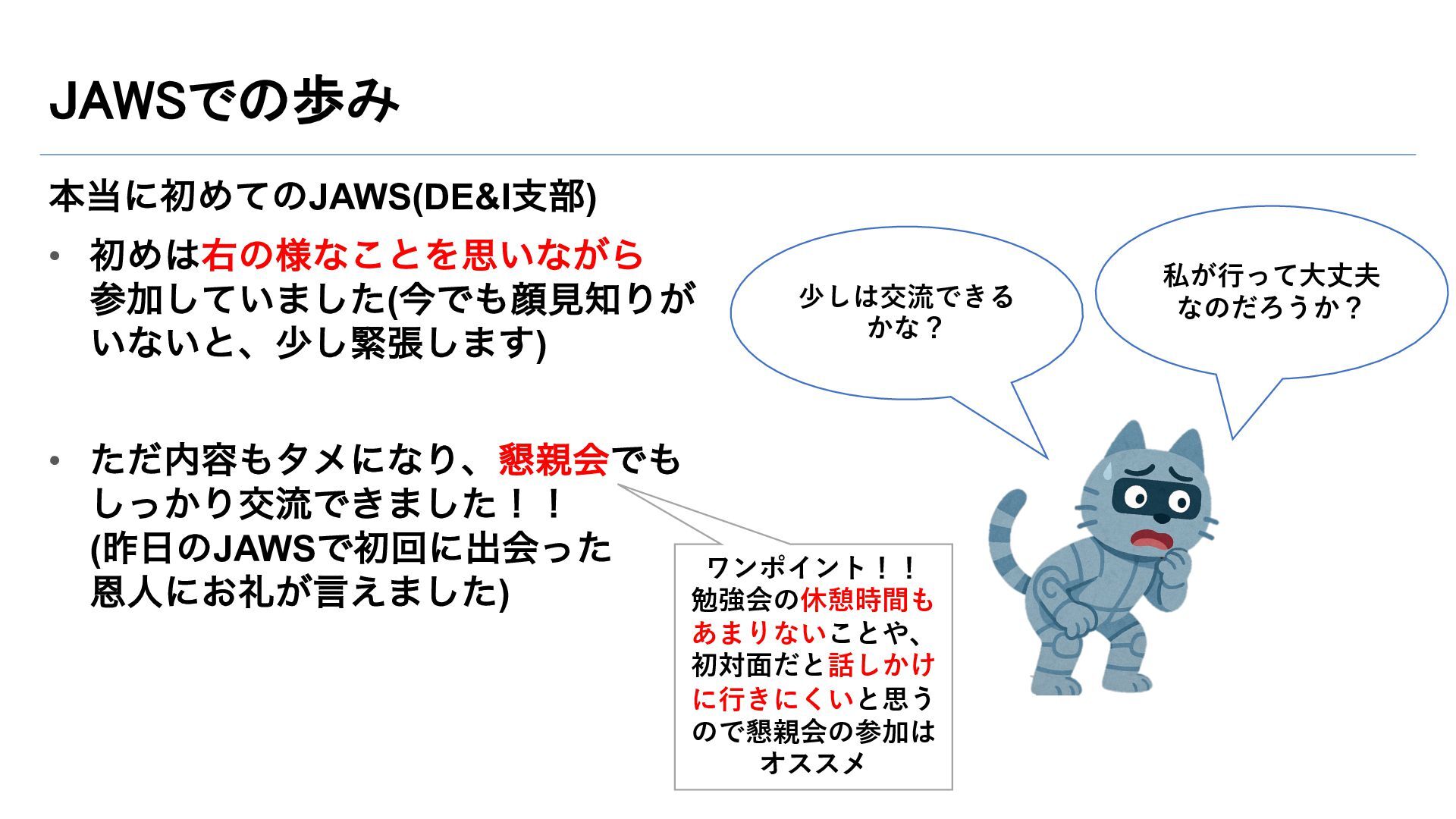 JAWSでの歩み 私が⾏って⼤丈夫 なのだろうか? 少しは交流できる かな? ワンポイント!! 勉強会の休憩時間も あまりないことや、 初対⾯だと話しかけ に⾏きにくいと思う ので懇親会の参加は オススメ