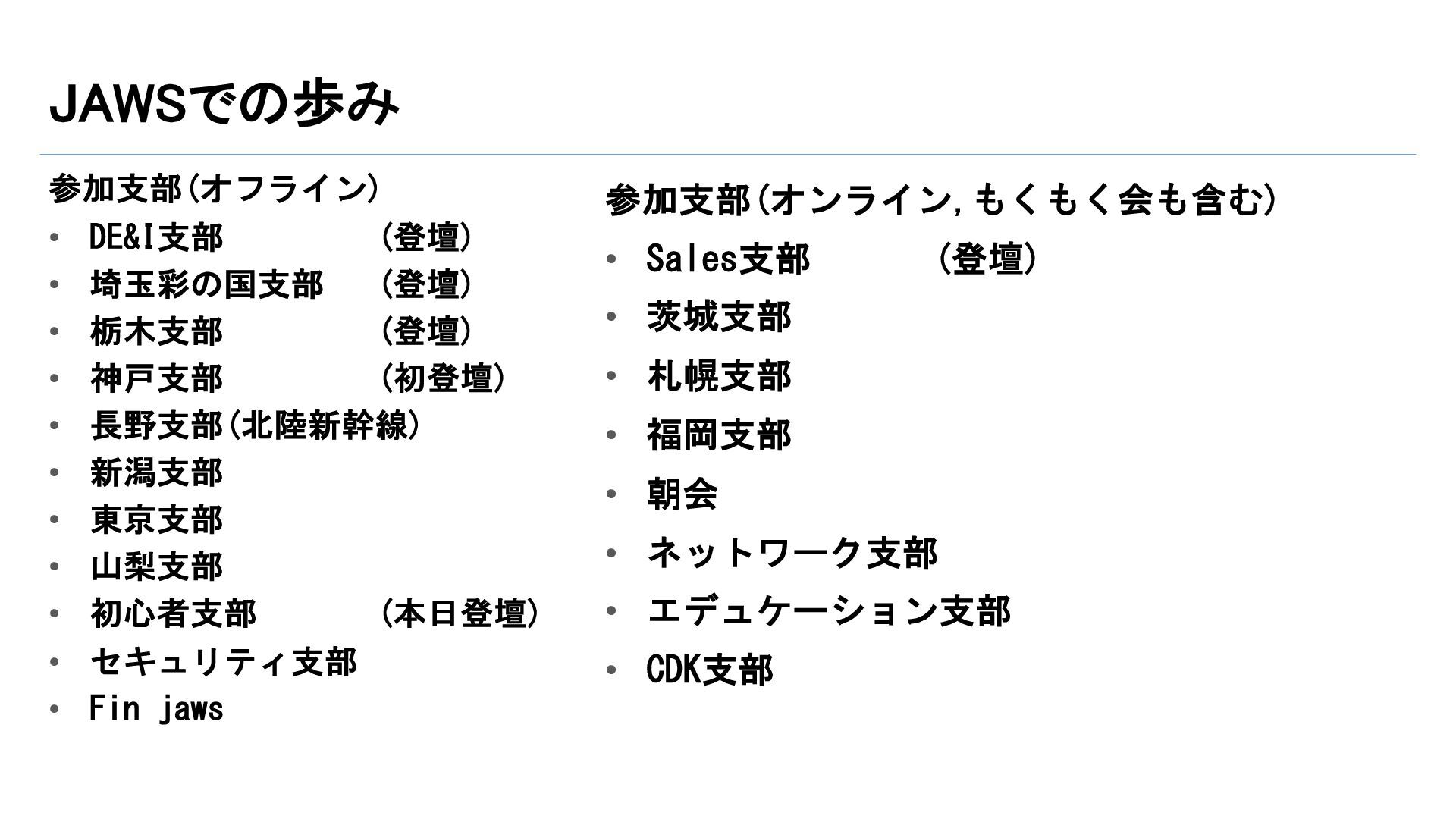 (登壇) • 神戸支部 (初登壇) • 長野支部(北陸新幹線) • 新潟支部 • 東京支部 • 山梨支部 • 初心者支部 (本日登壇) • セキュリティ支部 • Fin jaws 参加支部(オンライン,もくもく会も含む) • Sales支部 (登壇) • 茨城支部 • 札幌支部 • 福岡支部 • 朝会 • ネットワーク支部 • エデュケーション支部 • CDK支部
