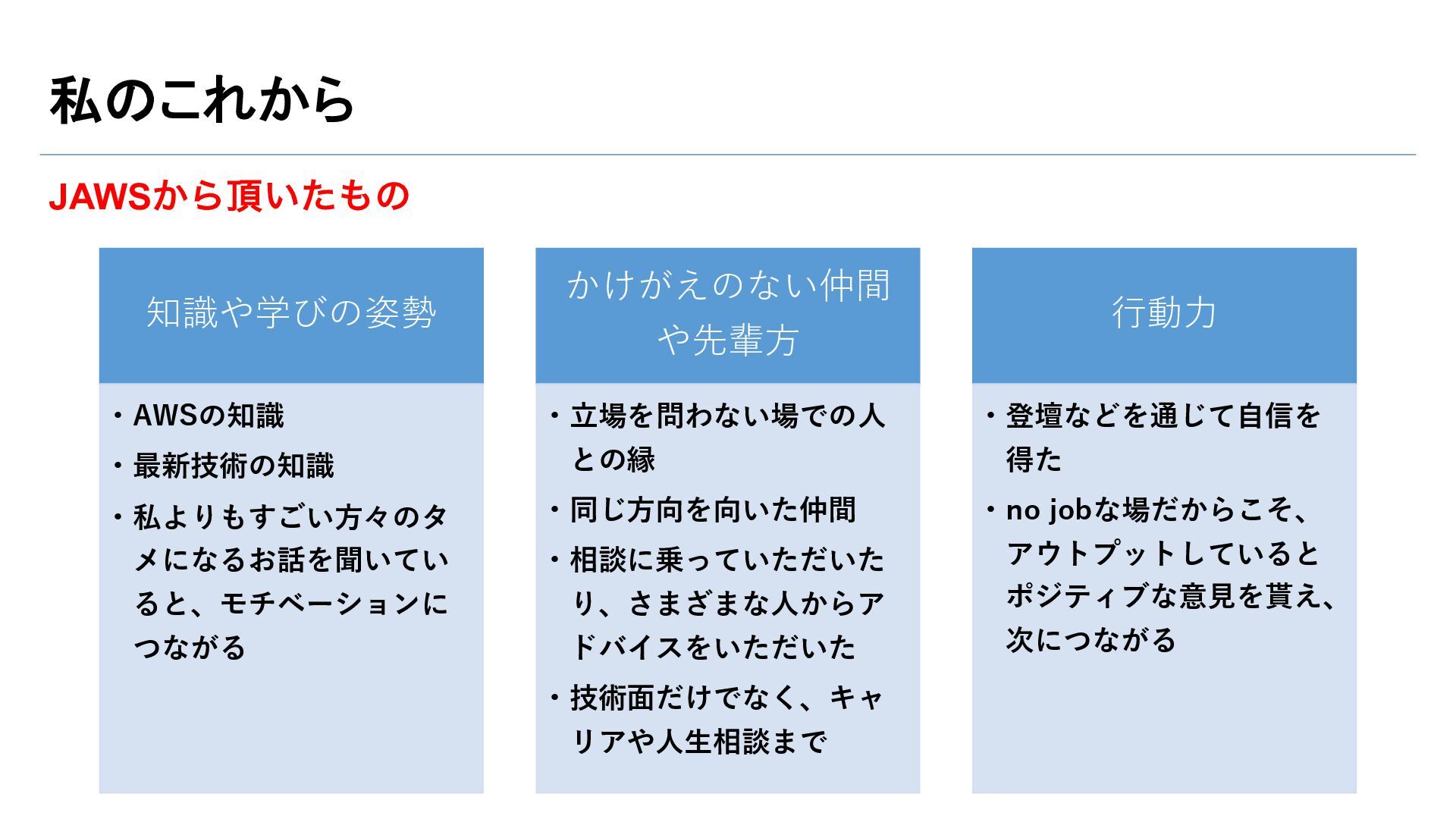 JAWS͔Β͍ͨͷ 私のこれから 知識や学びの姿勢 • AWSの知識 • 最新技術の知識 • 私よりもすごい⽅々のタ メになるお話を聞いてい