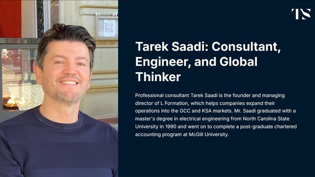 Professional consultant Tarek Saadi is the founder and managing director of L Formation, which helps companies expand their operations into the GCC and KSA markets. Mr. Saadi graduated with a master's degree in electrical engineering from North Carolina State University in 1990 and went on to complete a post-graduate chartered accounting program at McGill University.