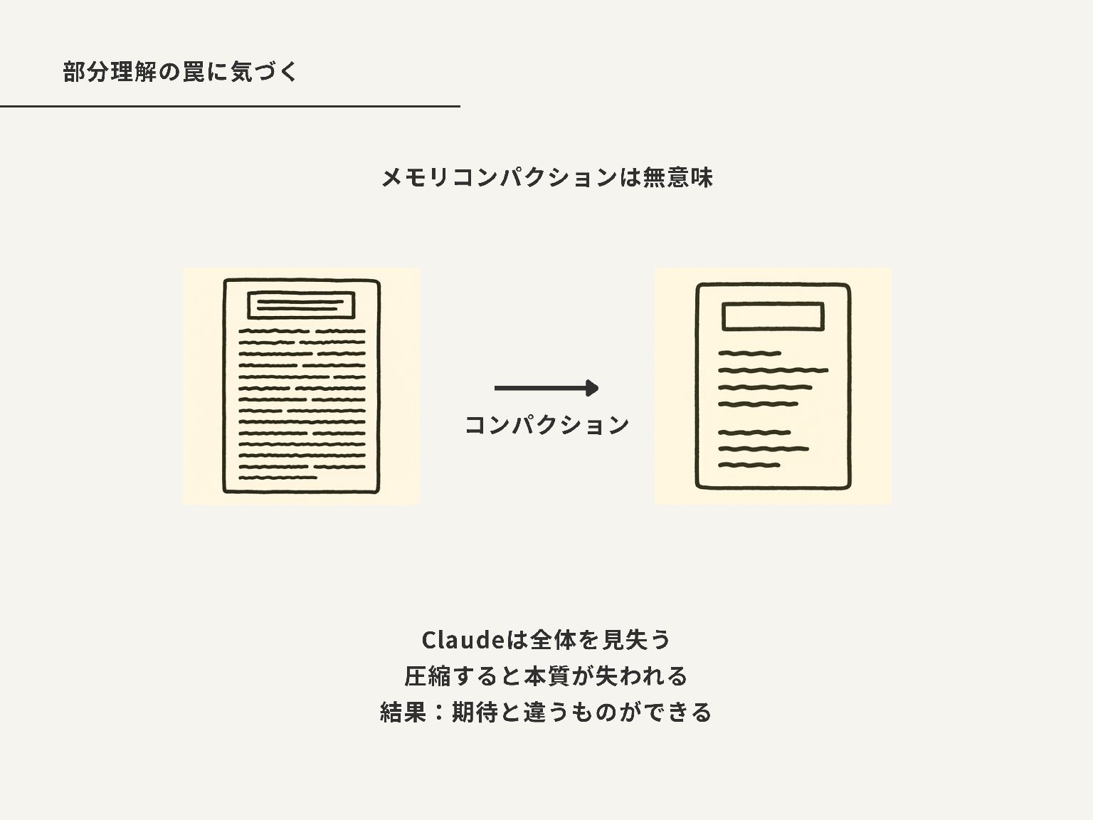 要するに、コンテキストウィンドウの制約を意識しましょうという話で、ちょっと大きいプロダクトを作ろうとすると、メモリの圧縮で細かい要求仕様が飛んでしまい、結果的に最初に意図としたものからズレたものができますよ。毎回要求仕様と設計書を読ませるのが良いですよ。という話です。