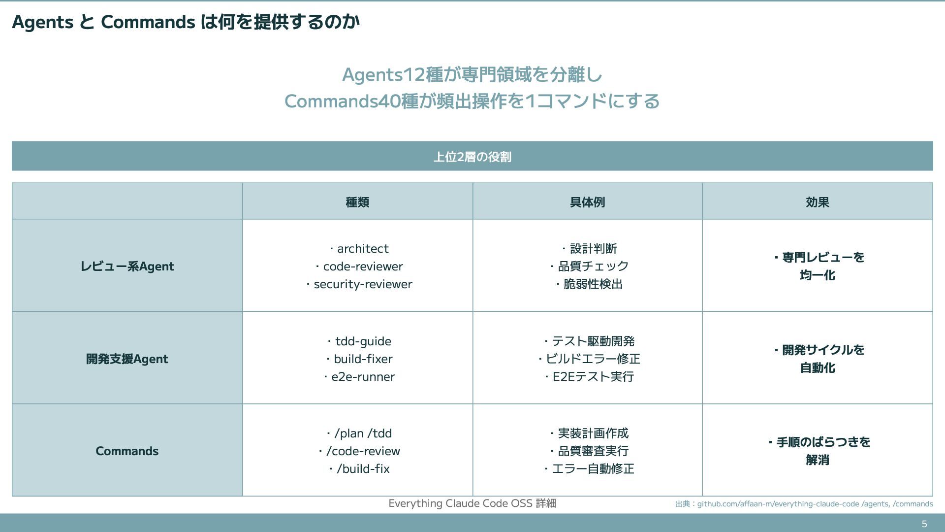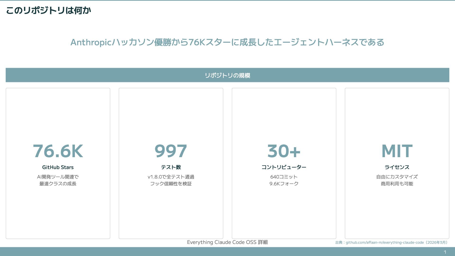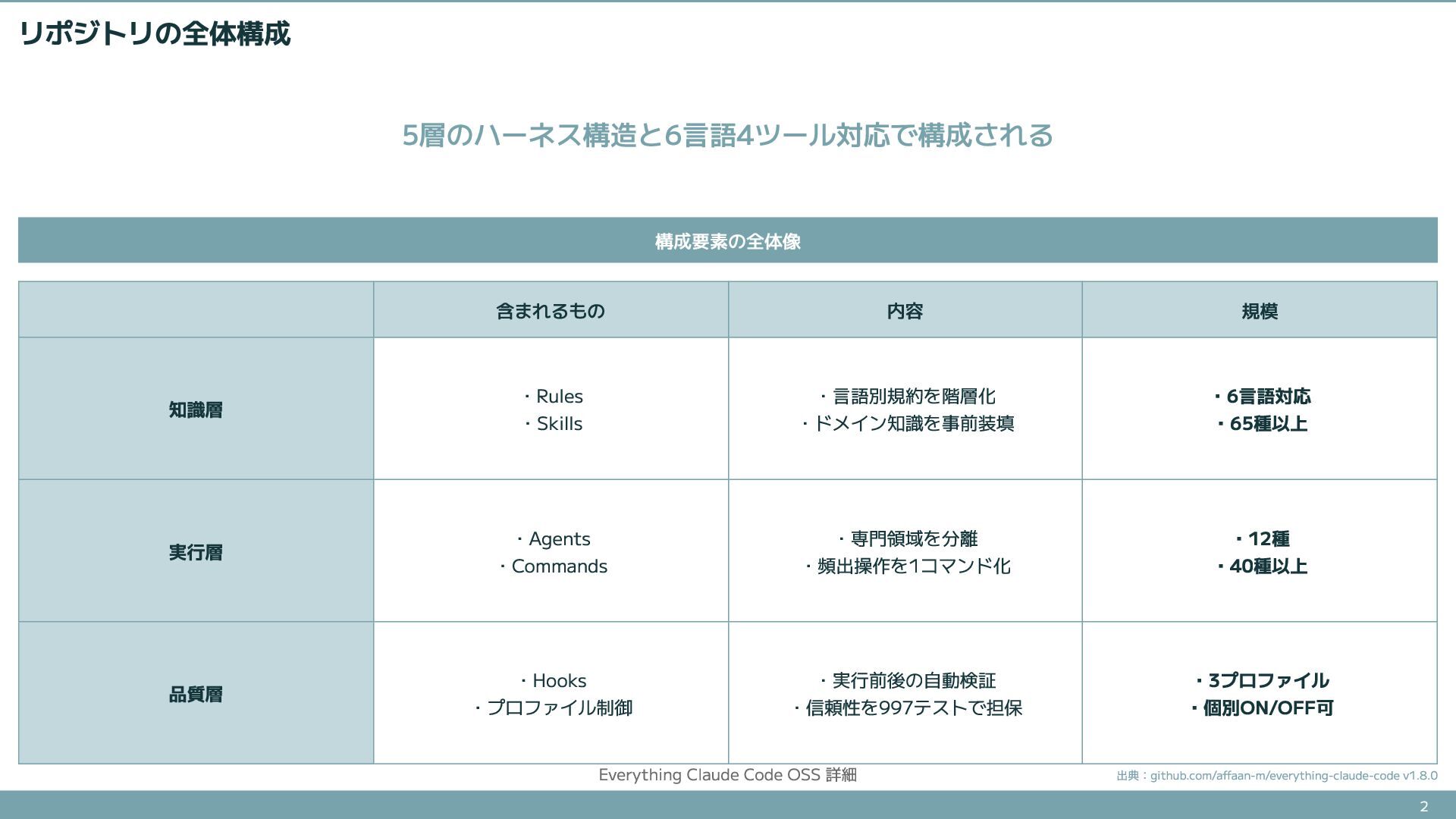 76.6Kスターを集めたエージェントハーネスOSSの詳細解説。知識層(Rules/Skills)、実行層(Agents/Commands)、品質層(Hooks)の具体的な中身と、install.shによる導入方法を紹介する。
