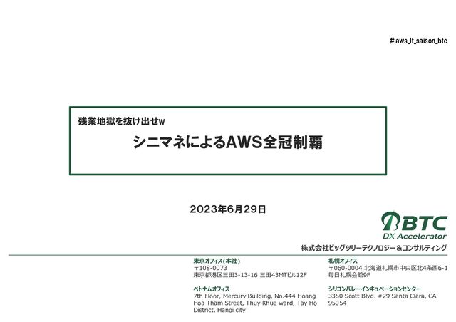 Hoang Hoa Tham Street, Thuy Khue ward, Tay Ho District, Hanoi city 札幌オフィス 〒060-0004 北海道札幌市中央区北4条西6-1 毎日札幌会館9F シリコンバレーインキュベーションセンター 3350 Scott Blvd. #29 Santa Clara, CA 95054 株式会社ビッグツリーテクノロジー&コンサルティング シニマネによるAWS全冠制覇 2023年6月29日 残業地獄を抜け出せw #aws_lt_saison_btc