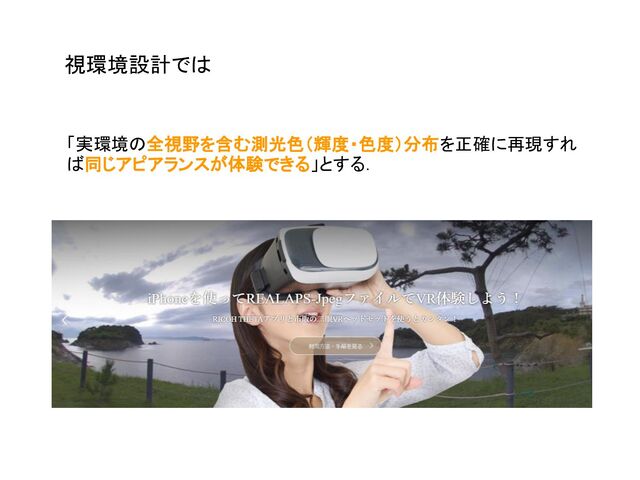 視環境設計では 「実環境の全視野を含む測光色(輝度・色度)分布を正確に再現すれ ば同じアピアランスが体験できる」とする.