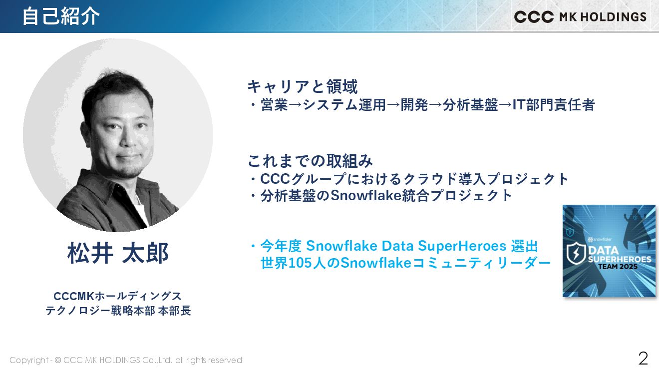 2 キャリアと領域 ・営業→システム運用→開発→分析基盤→IT部門責任者 これまでの取組み ・CCCグループにおけるクラウド導入プロジェクト ・分析基盤のSnowflake統合プロジェクト ・今年度 Snowflake Data SuperHeroes 選出 世界105人のSnowflakeコミュニティリーダー 自己紹介 CCCMKホールディングス テクノロジー戦略本部 本部長 松井 太郎