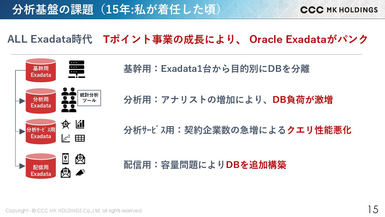12 分析基盤の課題(15年:私が着任した頃) 配信用 Exadata 分析サービス用 Exadata 分析用 Exadata 基幹用 Exadata ALL Exadata時代 基幹用:Exadata1台から目的別にDBを分離 分析用:アナリストの増加により、DB負荷が激増 分析サービス用:契約企業数の急増によるクエリ性能悪化 配信用:容量問題によりDBを追加構築 Tポイント事業の成長により、 Oracle Exadataがパンク 統計分析 ツール
