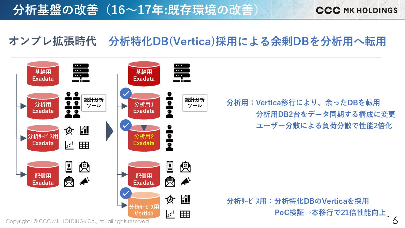 15 分析基盤の課題(15年:私が着任した頃) 配信用 Exadata 分析サービス用 Exadata 分析用 Exadata 基幹用 Exadata ALL Exadata時代 基幹用:Exadata1台から目的別にDBを分離 分析用:アナリストの増加により、DB負荷が激増 分析サービス用:契約企業数の急増によるクエリ性能悪化 配信用:容量問題によりDBを追加構築 Tポイント事業の成長により、 Oracle Exadataがパンク 統計分析 ツール
