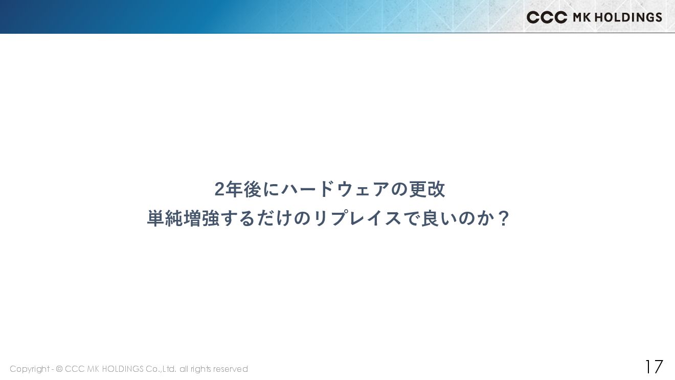 17 2年後にハードウェアの更改 単純増強するだけのリプレイスで良いのか?