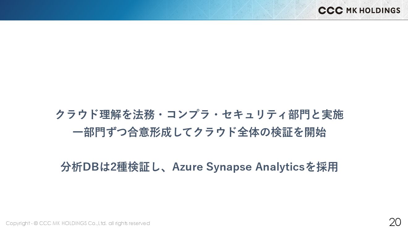 20 クラウド理解を法務・コンプラ・セキュリティ部門と実施 一部門ずつ合意形成してクラウド全体の検証を開始 分析DBは2種検証し、Azure Synapse Analyticsを採用