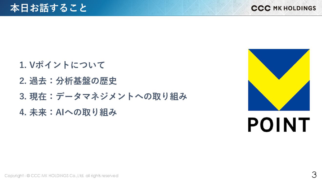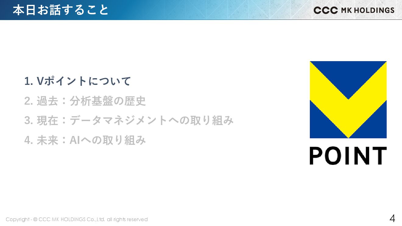 3 本日お話すること 1. Vポイントについて 2. 過去:分析基盤の歴史 3. 現在:データマネジメントへの取り組み 4. 未来:AIへの取り組み