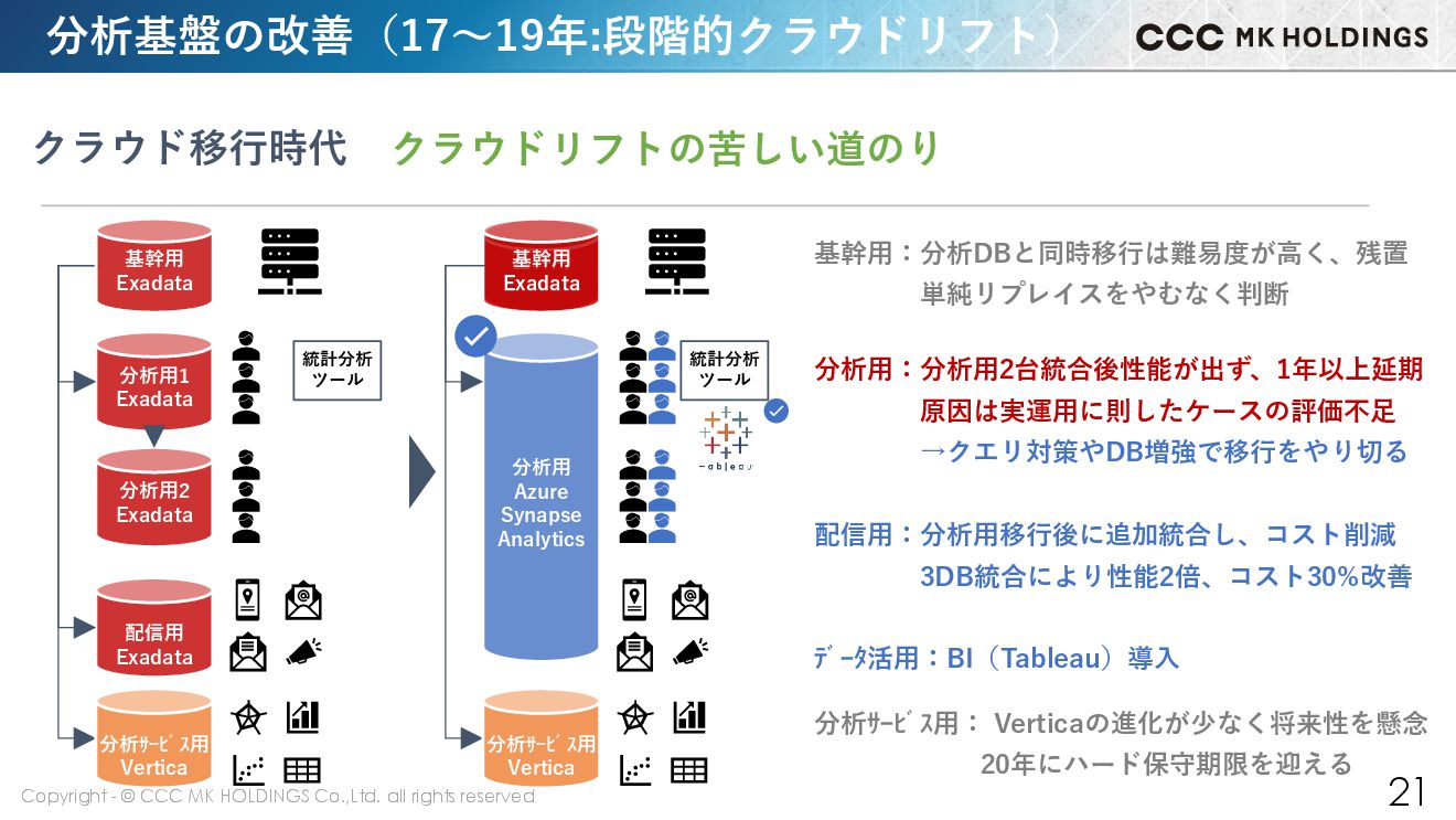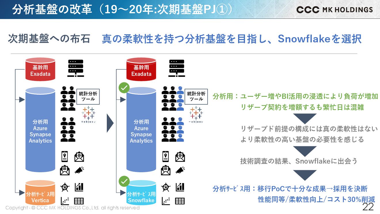 21 配信用 Exadata 分析用2 Exadata 分析用1 Exadata 分析サービス用 Vertica 統計分析 ツール 基幹用 Exadata 分析用 Azure Synapse Analytics 基幹用 Exadata 分析サービス用 Vertica 統計分析 ツール クラウドリフトの苦しい道のり クラウド移行時代 分析用:分析用2台統合後性能が出ず、1年以上延期 原因は実運用に則したケースの評価不足 →クエリ対策やDB増強で移行をやり切る 配信用:分析用移行後に追加統合し、コスト削減 3DB統合により性能2倍、コスト30%改善 データ活用:BI(Tableau)導入 分析サービス用: Verticaの進化が少なく将来性を懸念 20年にハード保守期限を迎える 基幹用:分析DBと同時移行は難易度が高く、残置 単純リプレイスをやむなく判断 分析基盤の改善(17~19年:段階的クラウドリフト) 基幹用 Exadata
