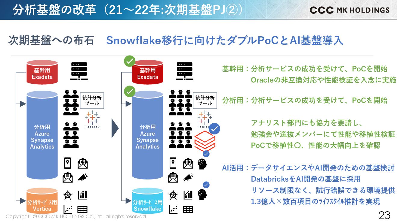 22 分析サービス用 Vertica 統計分析 ツール 基幹用 Exadata 分析用 Azure Synapse Analytics 基幹用 Exadata 分析サービス用 Snowflake 統計分析 ツール 真の柔軟性を持つ分析基盤を目指し、Snowflakeを選択 次期基盤への布石 分析用:ユーザー増やBI活用の浸透により負荷が増加 リザーブ契約を増額するも繁忙日は混雑 リザーブド前提の構成には真の柔軟性はない より柔軟性の高い基盤の必要性を感じる 技術調査の結果、Snowflakeに出会う 分析基盤の改革(19~20年:次期基盤PJ①) 分析サービス用:移行PoCで十分な成果→採用を決断 性能同等/柔軟性向上/コスト30%削減 分析用 Azure Synapse Analytics 基幹用 Exadata