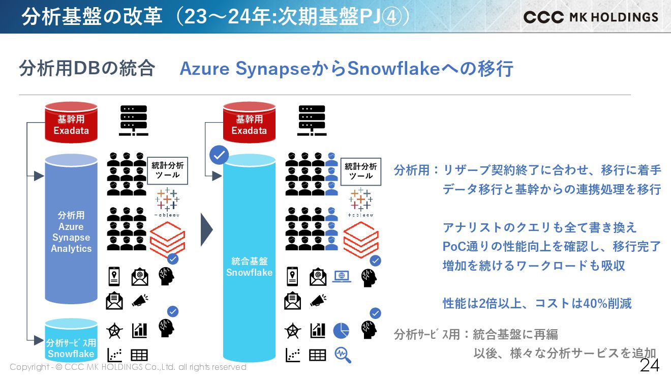 23 分析サービス用 Vertica 統計分析 ツール 基幹用 Exadata 分析用 Azure Synapse Analytics 基幹用 Exadata 分析サービス用 Snowflake 統計分析 ツール Snowflake移行に向けたダブルPoCとAI基盤導入 次期基盤への布石 分析基盤の改革(21~22年:次期基盤PJ②) 分析用:分析サービスの成功を受けて、PoCを開始 アナリスト部門にも協力を要請し、 勉強会や選抜メンバーにて性能や移植性検証 PoCで移植性〇、性能の大幅向上を確認 AI活用:データサイエンスやAI開発のための基盤検討 DatabricksをAI開発の基盤に採用 リソース制限なく、試行錯誤できる環境提供 1.3億人×数百項目のライフスタイル推計を実現 基幹用:分析サービスの成功を受けて、PoCを開始 Oracleの非互換対応や性能検証を入念に実施 分析用 Azure Synapse Analytics 基幹用 Exadata
