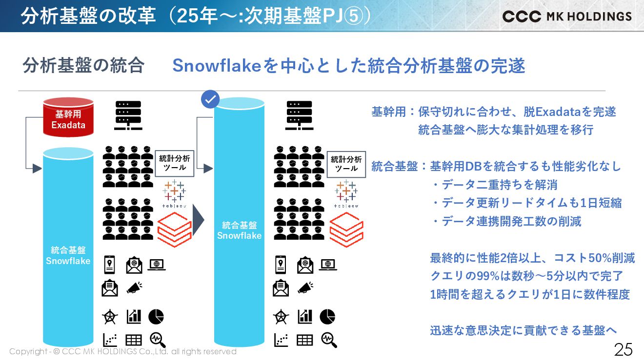 24 基幹用 Exadata 分析用 Azure Synapse Analytics 基幹用 Exadata 分析サービス用 Snowflake Azure SynapseからSnowflakeへの移行 分析用DBの統合 分析基盤の改革(23~24年:次期基盤PJ④) 統計分析 ツール 基幹用 Exadata 基幹用 Exadata 統合基盤 Snowflake 統計分析 ツール 分析サービス用:統合基盤に再編 以後、様々な分析サービスを追加 分析用:リザーブ契約終了に合わせ、移行に着手 データ移行と基幹からの連携処理を移行 アナリストのクエリも全て書き換え PoC通りの性能向上を確認し、移行完了 増加を続けるワークロードも吸収 性能は2倍以上、コストは40%削減