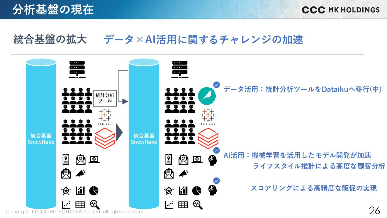 26 統合基盤 Snowflake 分析基盤の現在 データ×AI活用に関するチャレンジの加速 統合基盤の拡大 データ活用:統計分析ツールをDataikuへ移行(中) AI活用:機械学習を活用したモデル開発が加速 ライフスタイル推計による高度な顧客分析 スコアリングによる高精度な販促の実現 統合基盤 Snowflake 統計分析 ツール