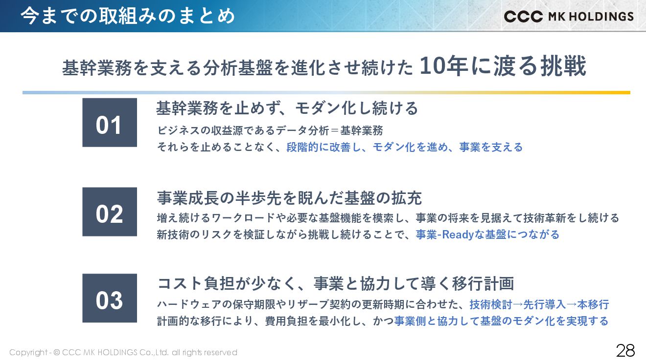 27 分析基盤のフェーズと実現したもの ユーザー数 クエリ時間 取引先 分析約20名 数時間、丸1日以上 ポイント提携企業 ワークロード 定期帳票 分析40名+BI数十名 数十分~半日 ポイント提携企業・メーカー他 業界横断分析、BI 分析70名+BI数百名+データサイエンス 数秒~数分 ポイント・多種多様な企業・自治体 多様な分析、BI浸透、AI開発 会員数 1億人 15年~17年 17年~20年 21年~25年 有効V会員数 1.3億人 事業継続性確保のための最適化 事業成長のためのクラウドリフト データ×AI事業実現へのシフト