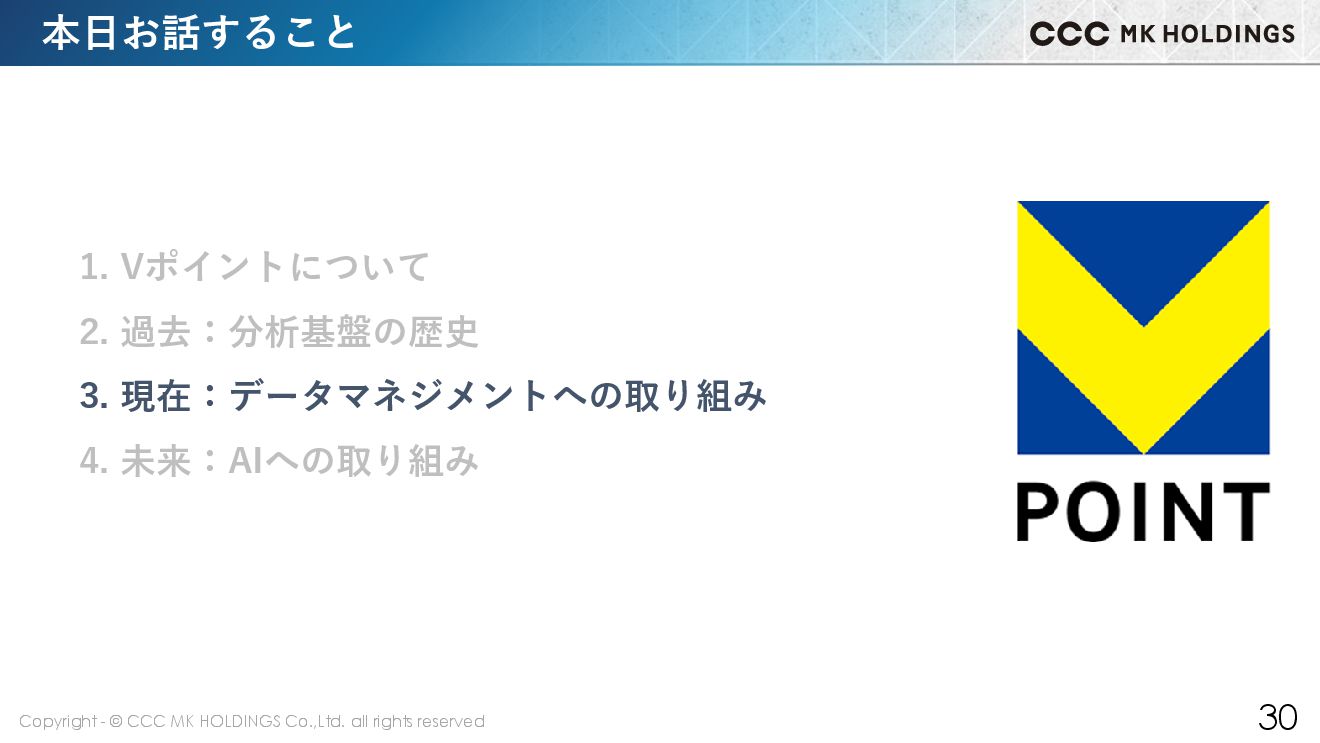 30 本日お話すること 1. Vポイントについて 2. 過去:分析基盤の歴史 3. 現在:データマネジメントへの取り組み 4. 未来:AIへの取り組み